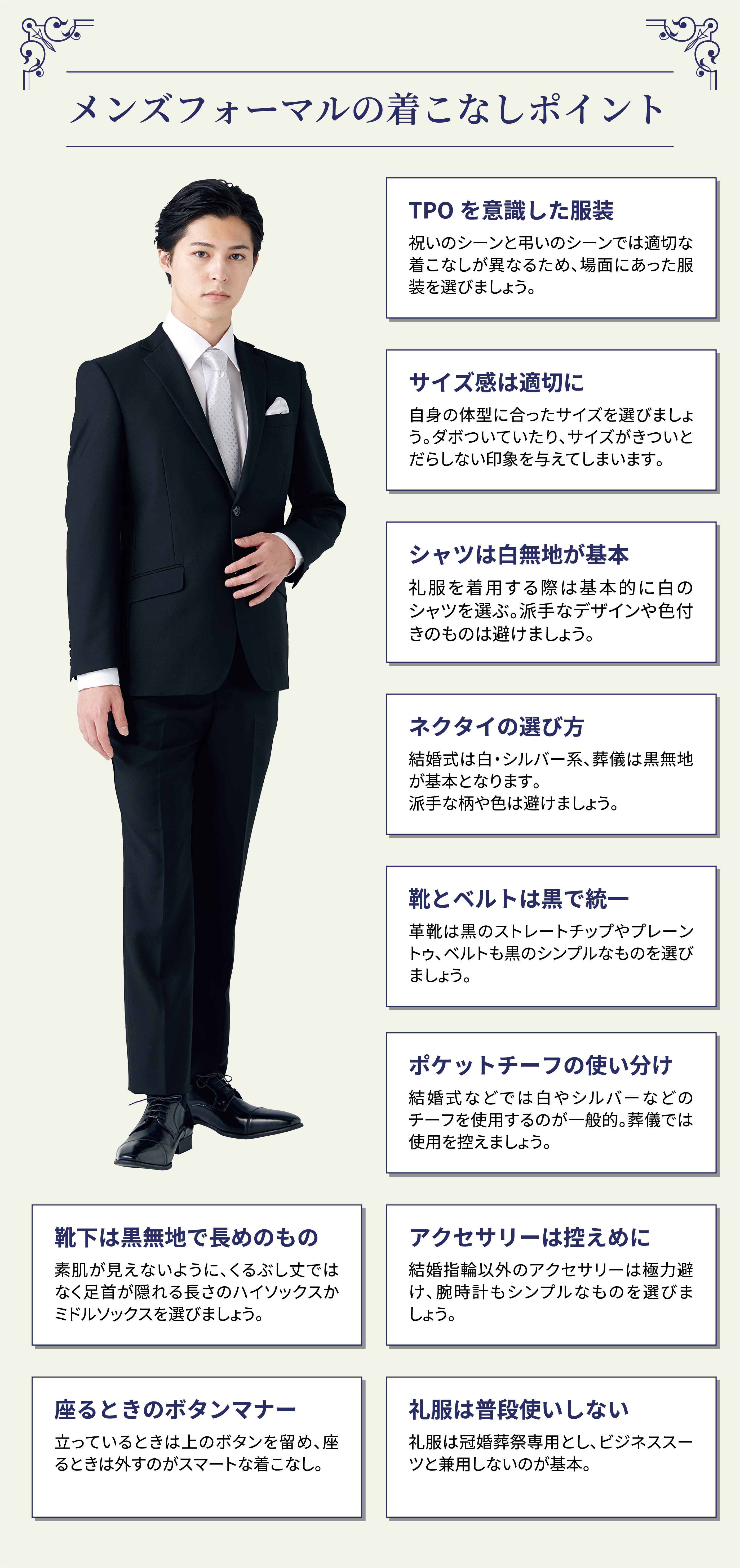 ブラックやネイビー、グレーなどのダーク系カラーのスーツや、ベスト付きのスリーピーススーツを紹介し、華やかさと節度を兼ね備えた装いを提案します。​さらに、ワイシャツやネクタイ、シューズなどの小物選びのポイントも掲載し、スーツコーディネートの参考にしていただけます。