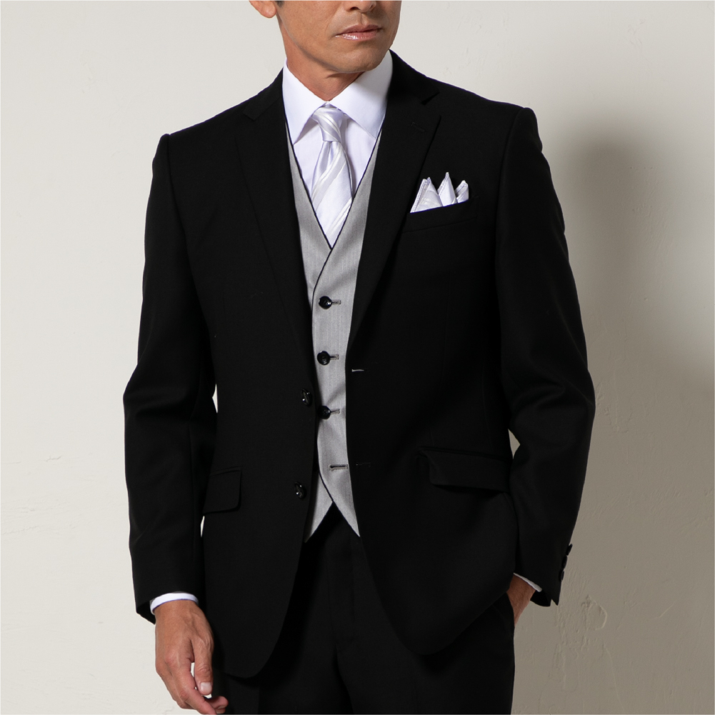 ダーク系スーツに色違いのベストを組み合わせた正統派スタイルや、3ピーススーツに蝶ネクタイを合わせたモダンスタイルなど、シーンに応じた装いをご提案。