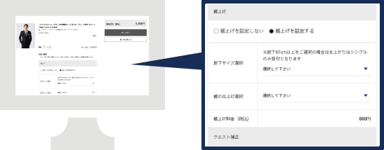 カートに入れた後、お直し設定から「裾上げを設定する」にチェックを入れ、股下サイズおよび裾の仕上がりを選択ください。