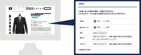 サイズをご確認後、スーツ詳細画面裾上げプルダウンメニュー、スーツ詳細画面の「裾上げ希望する」にチェックを入れ、お測りいただいた、股下サイズ及び、裾上げをプルダウンで選択ください。