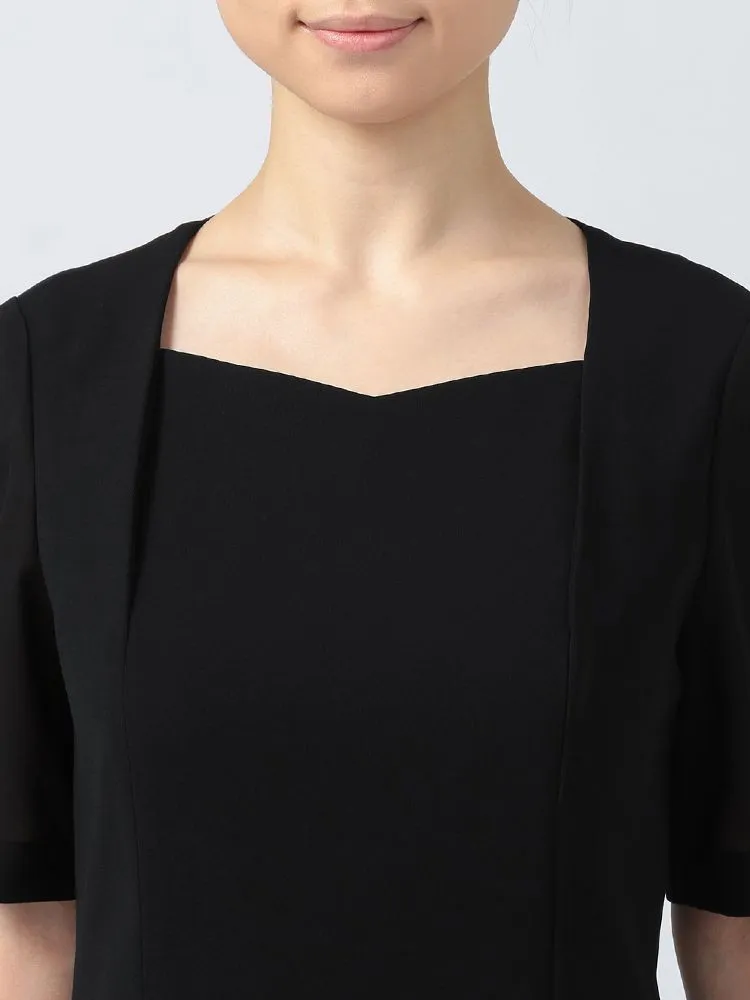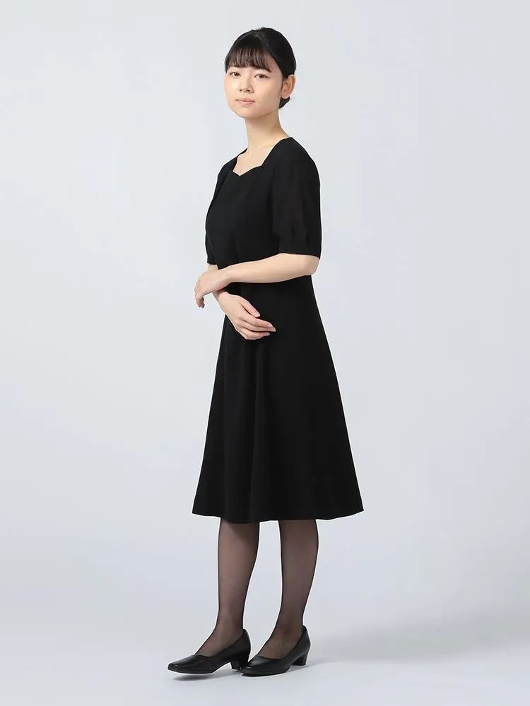 スクエアネックデザインのワンピースで長年愛用できるシンプルなアンサンブルに仕上げました。