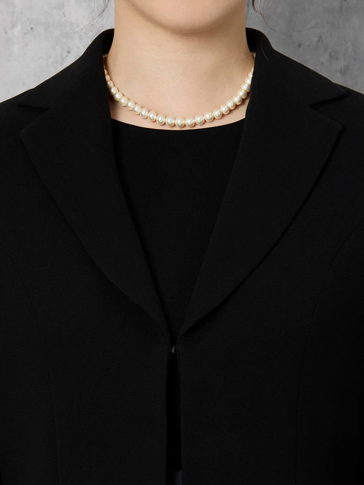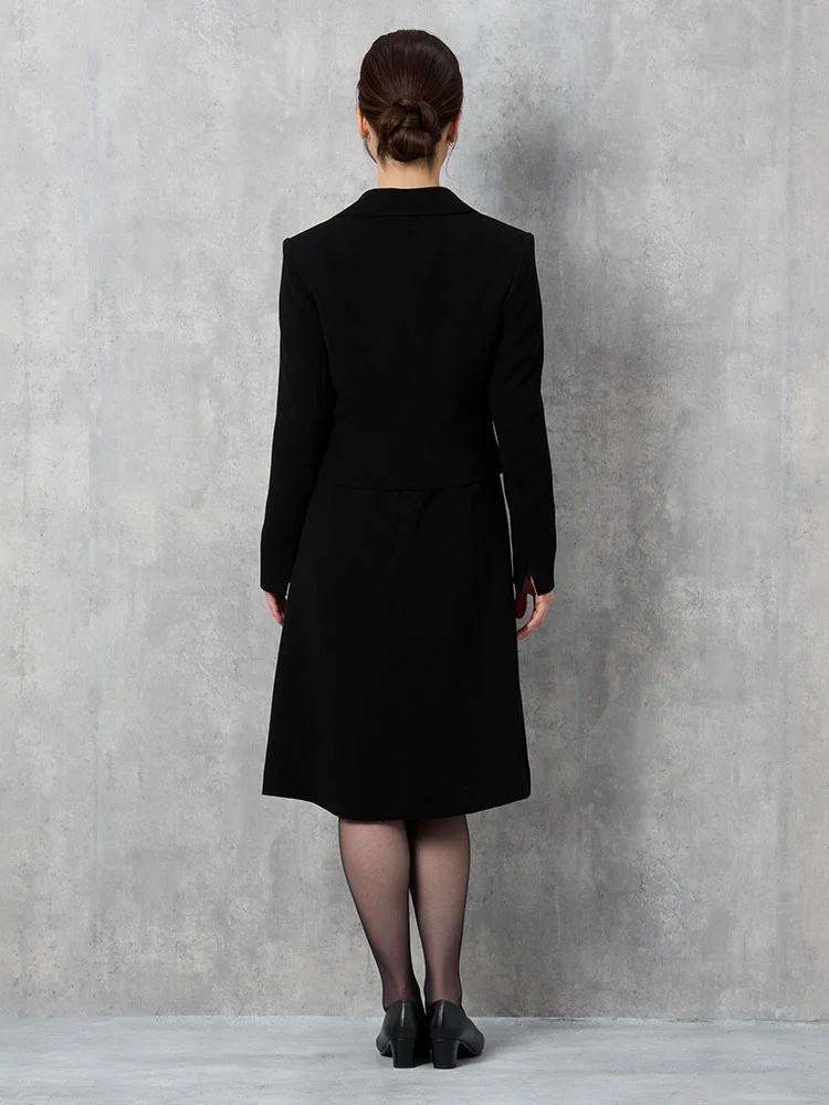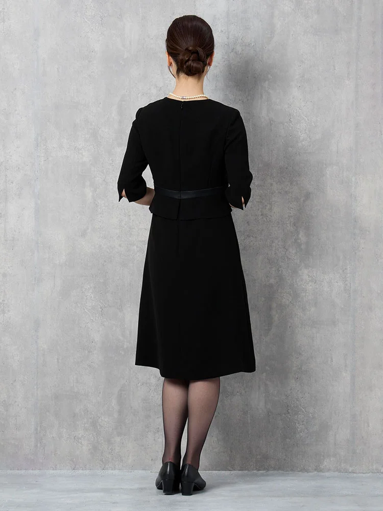 テーラードスーツ風に着こなせるペプラムワンピースとジャケットのアンサンブルです。
