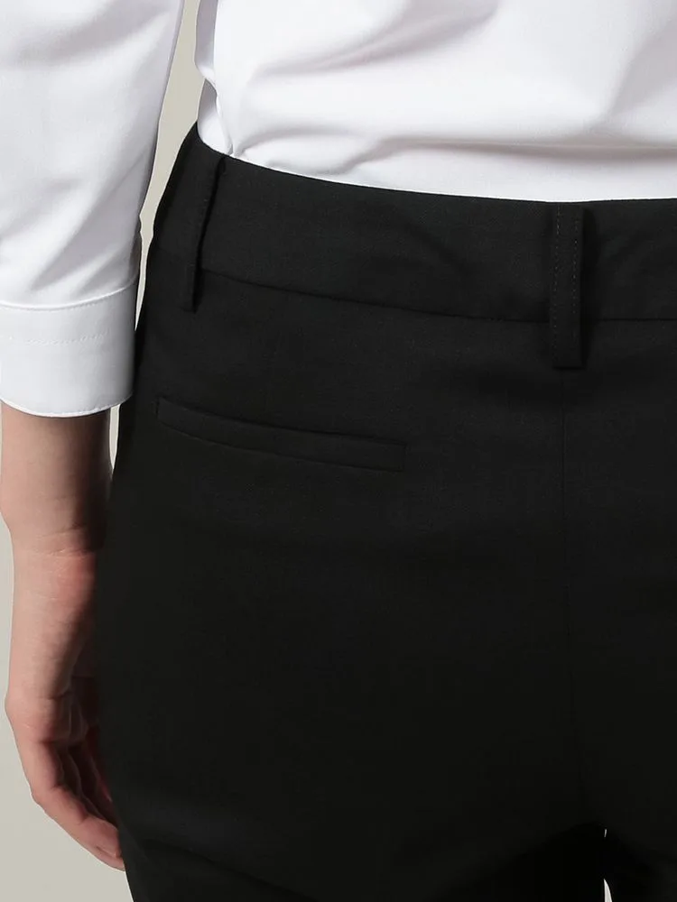 パンツの腰回りに生地の折り込みがなく、スッキリとしたシルエットを実現します。シンプルで洗練された印象を与え、すっきりとした着こなしが可能です。