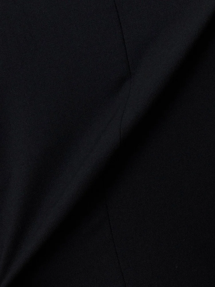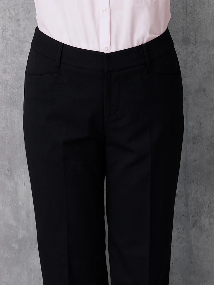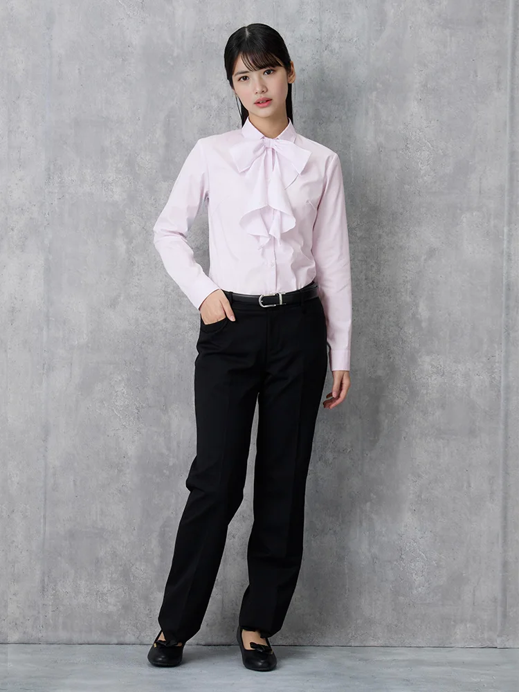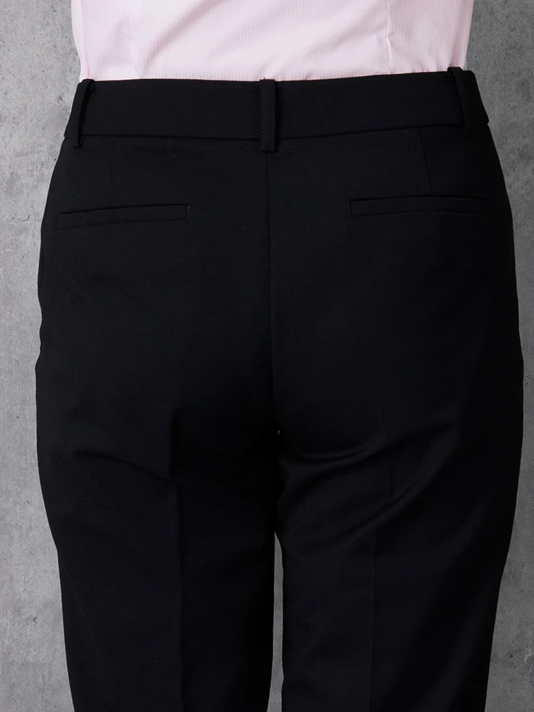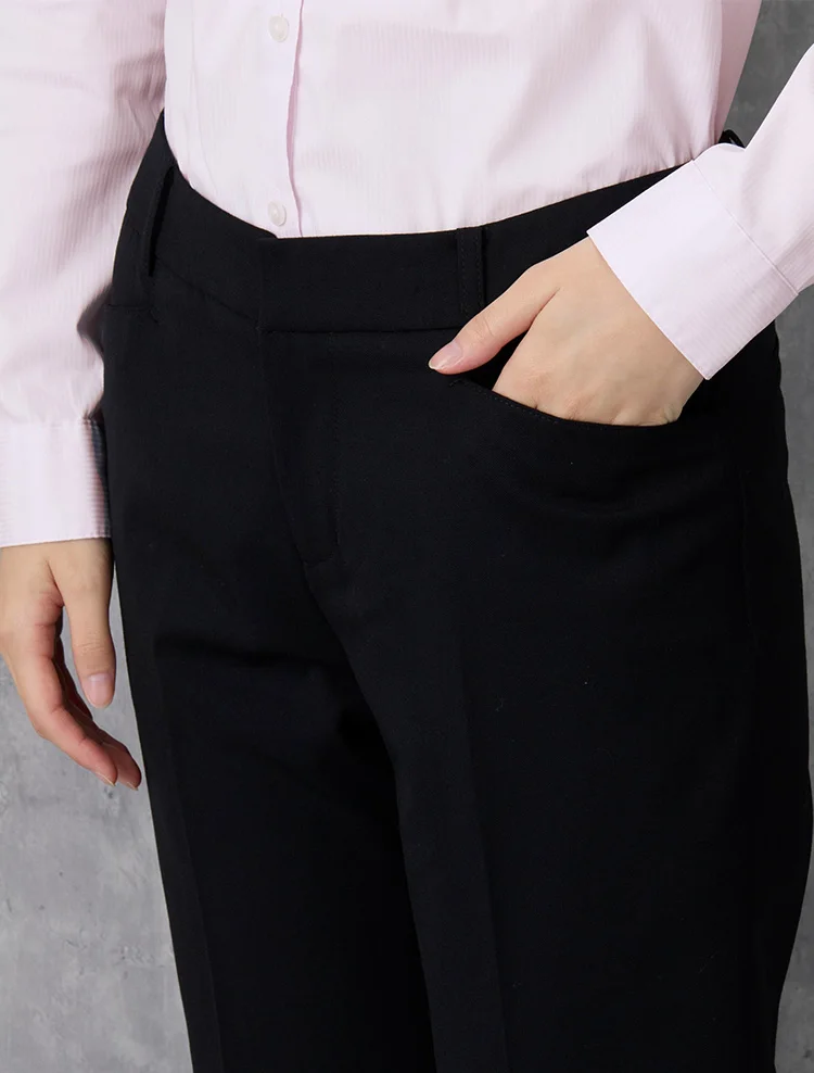 パンツの腰回りに生地の折り込みがなく、スッキリとしたシルエットを実現します。シンプルで洗練された印象を与え、すっきりとした着こなしが可能です。
