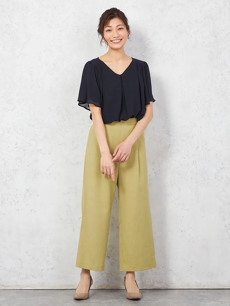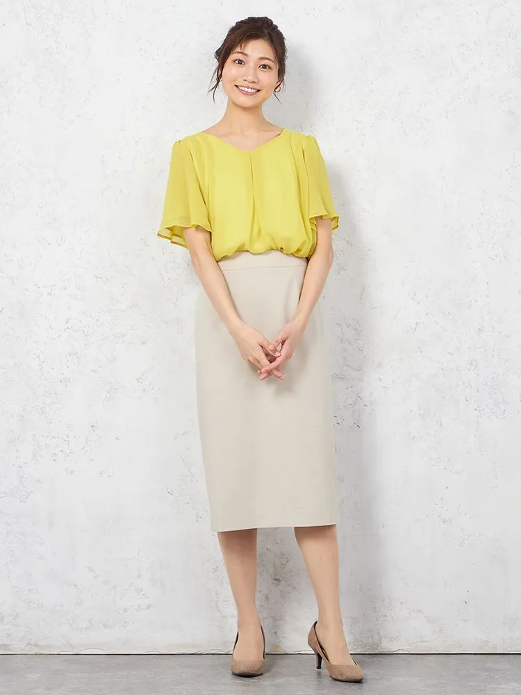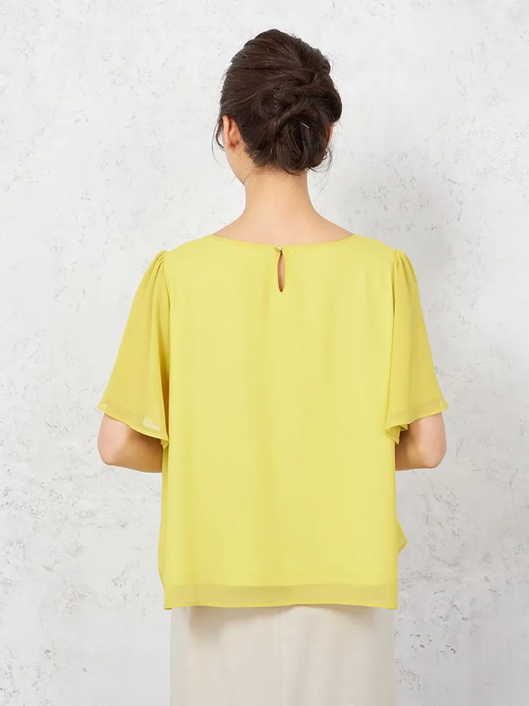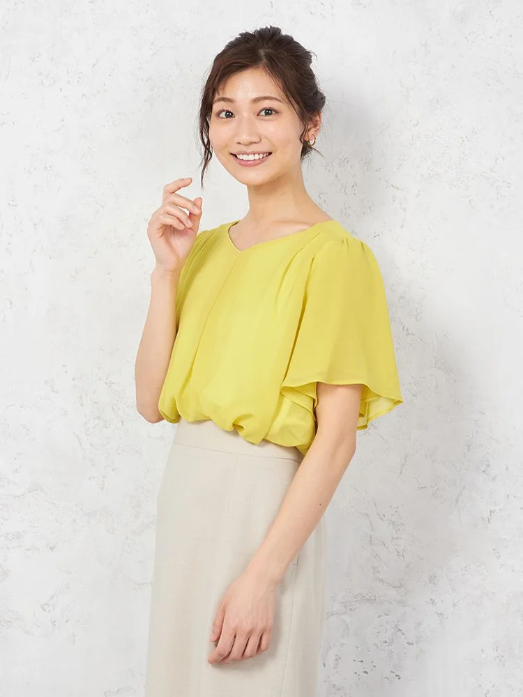 【ハンドウォッシャブル】ブラウス 半袖 フレアスリーブ シフォンブラウス 無地 SOFFICE 春夏【レディース】(イエロー)