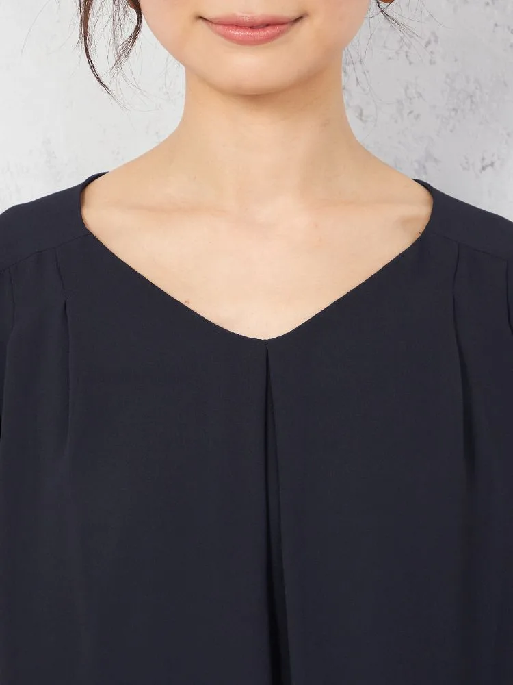 ネックは浅めのV開きで、鎖骨ラインがすっきりと映えます。