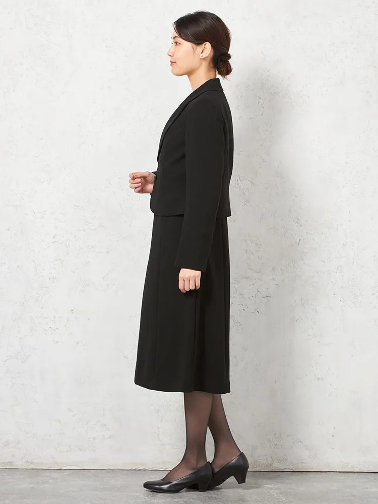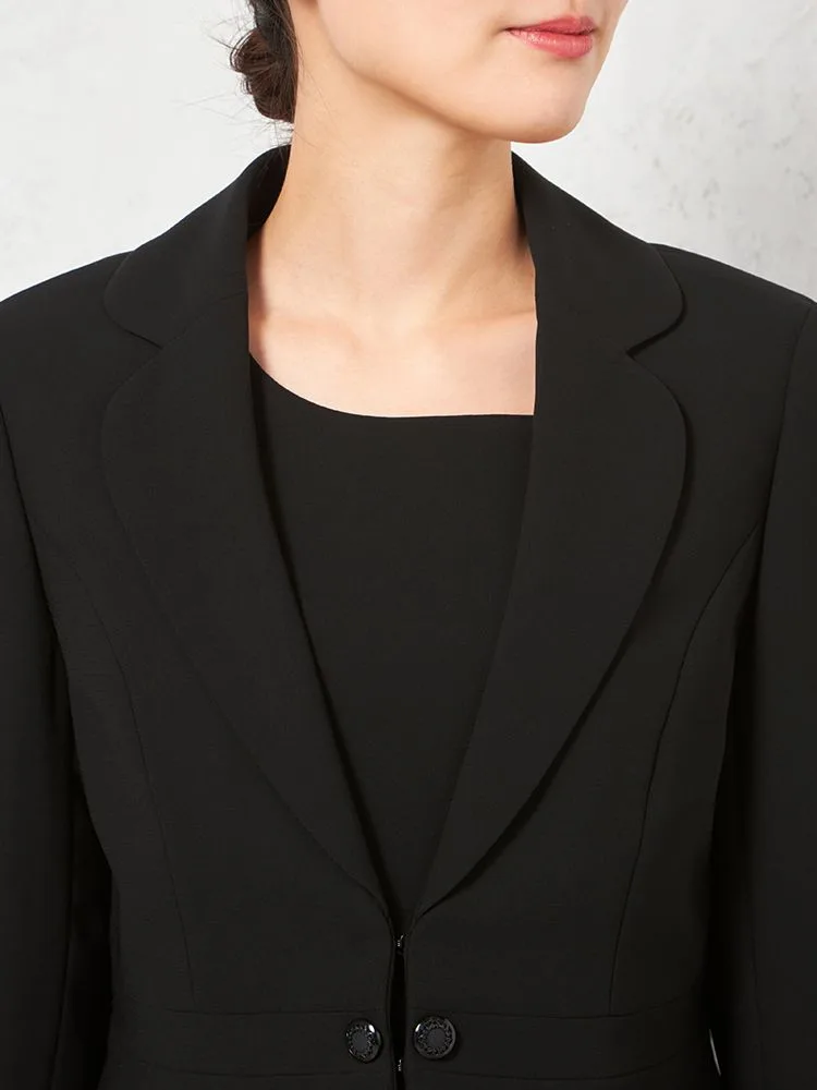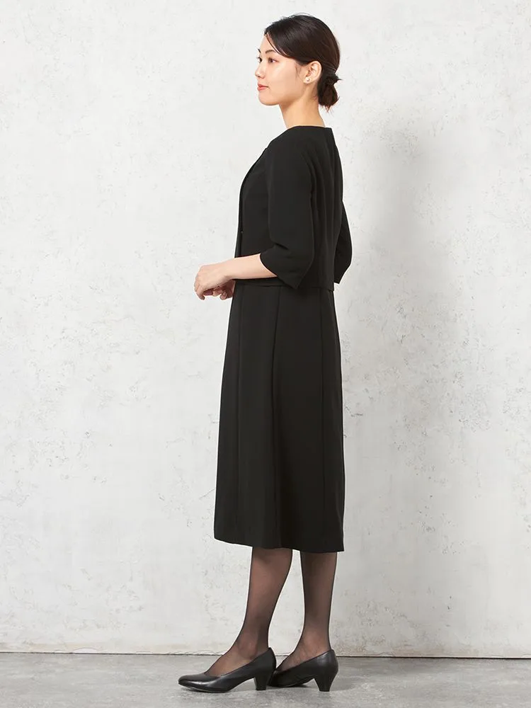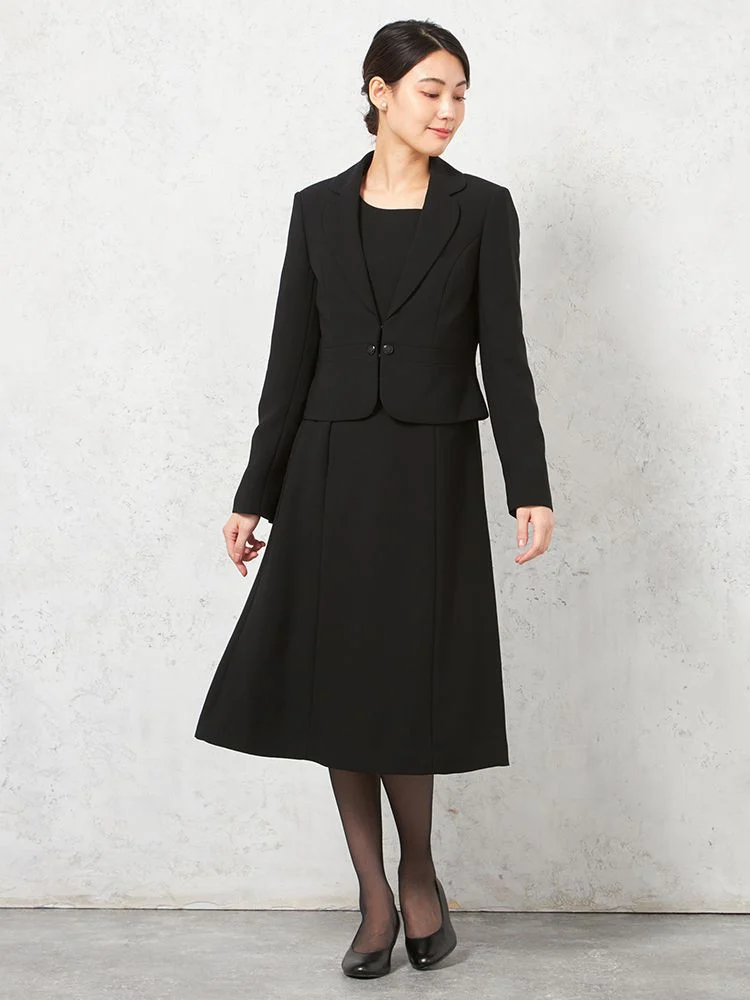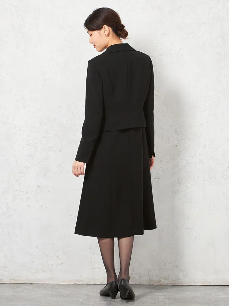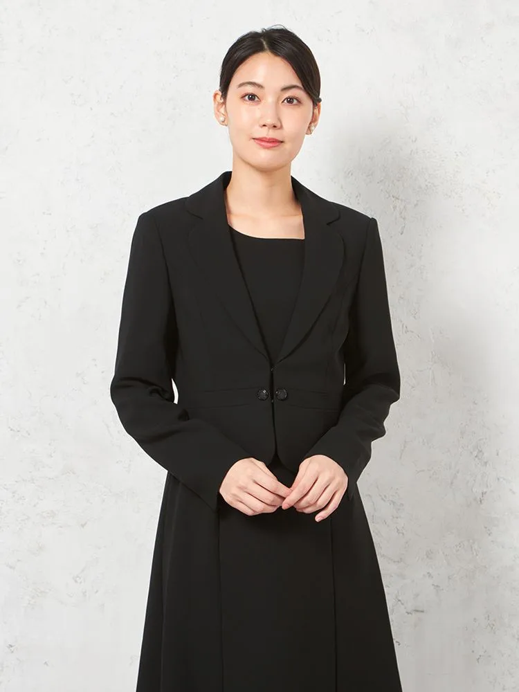 テーラードジャケットとワンピースのブラックフォーマルアンサンブル。