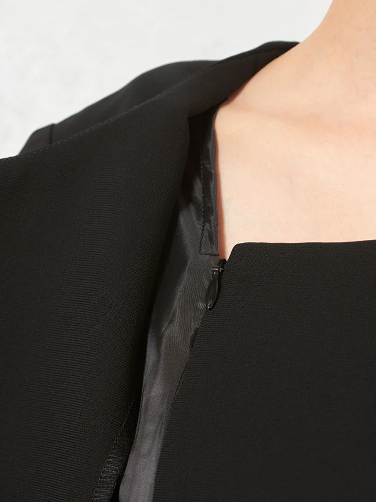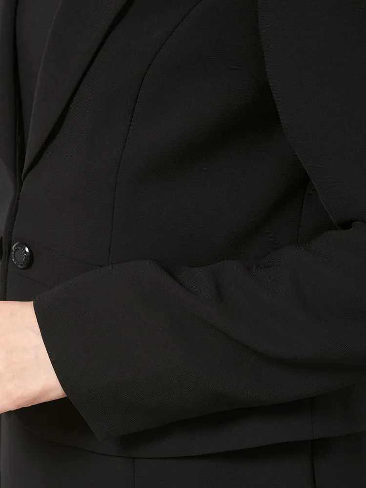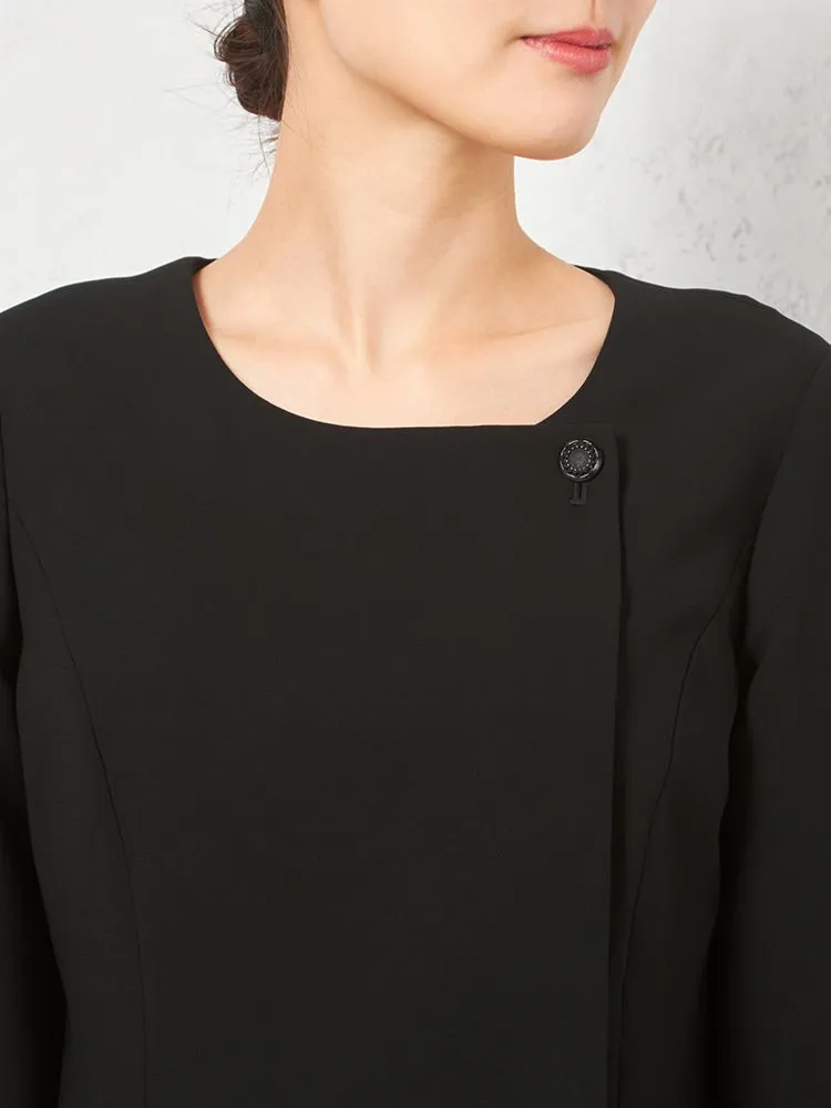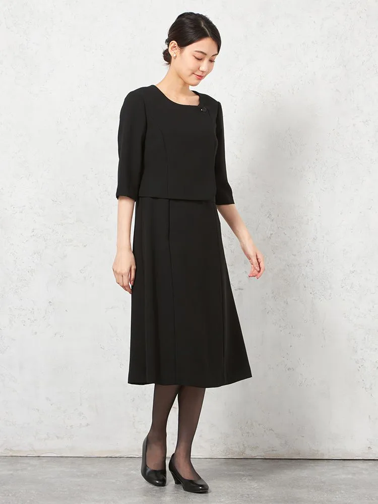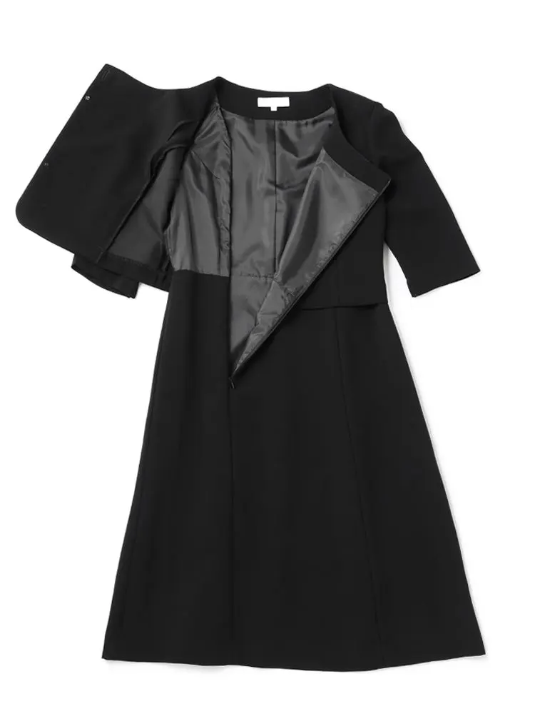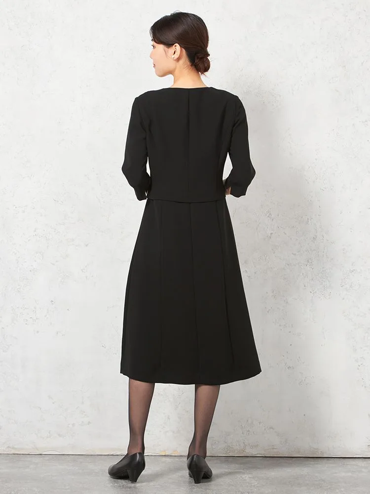 テーラードジャケットとワンピースのブラックフォーマルアンサンブル。