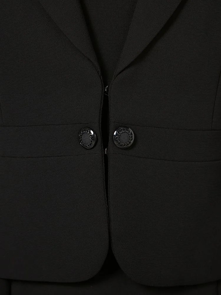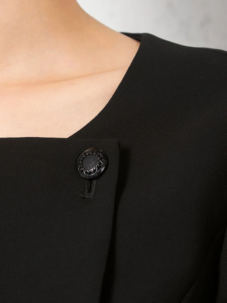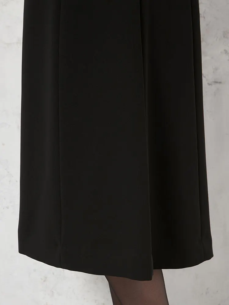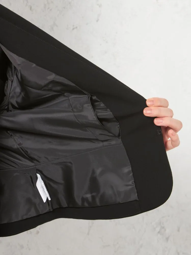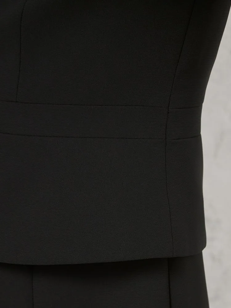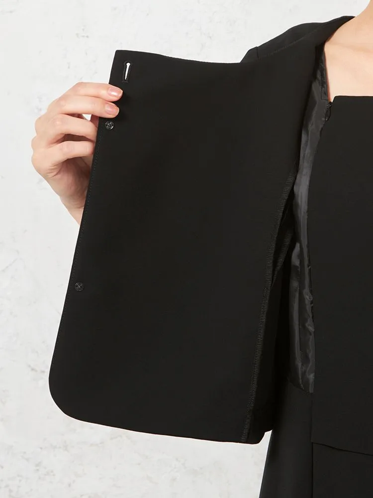 テーラードジャケットとワンピースのブラックフォーマルアンサンブル。