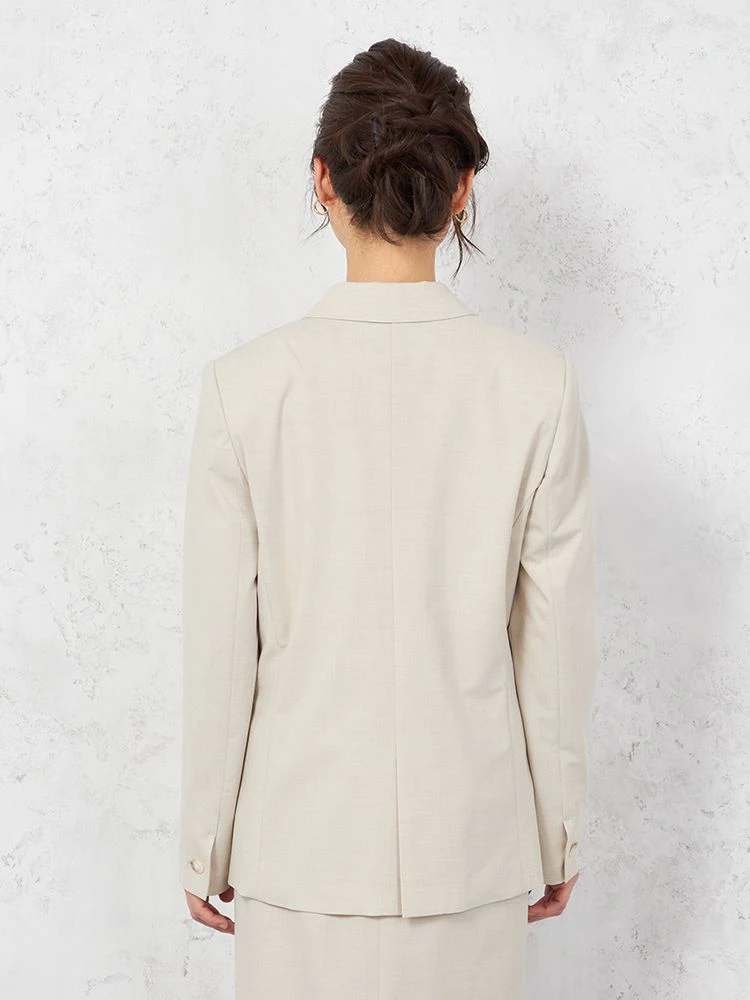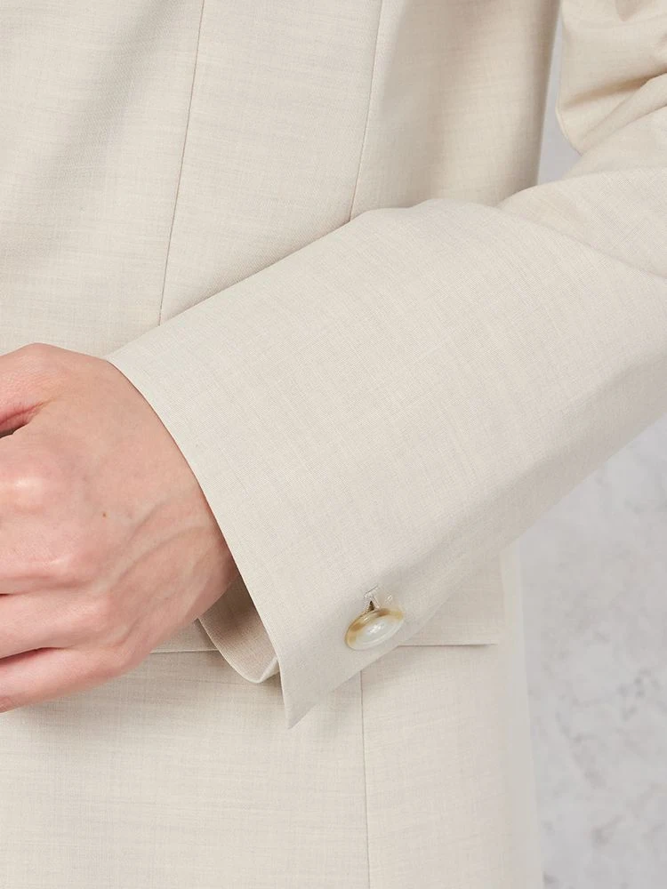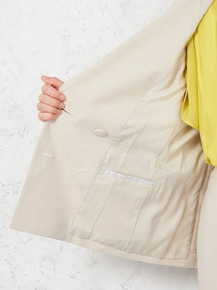 ミックスカラーのボタンがポイントになった、ダブルブレストのジャケットです。