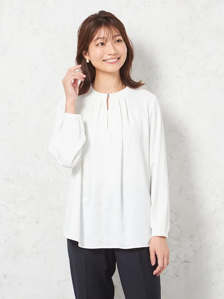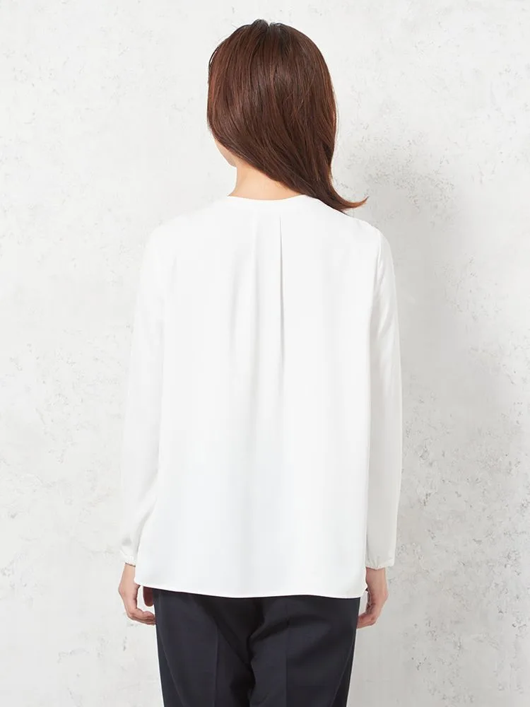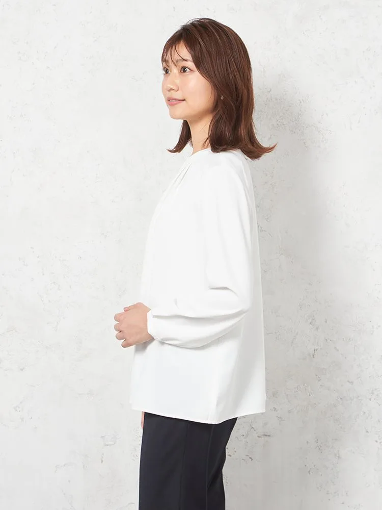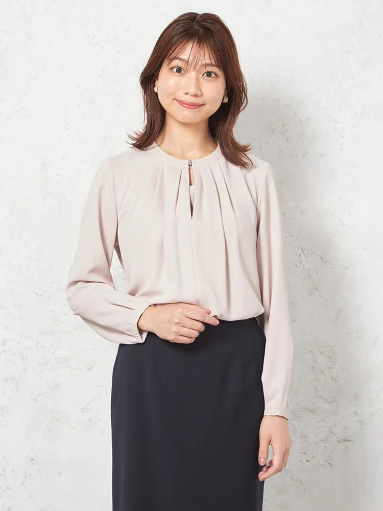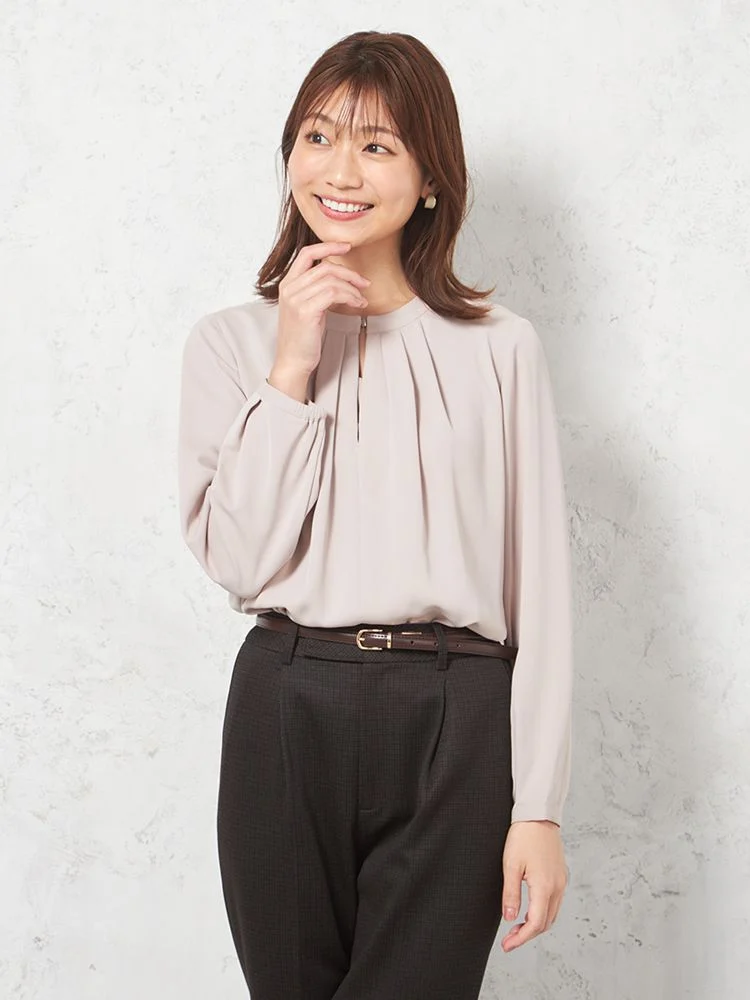 【ウォッシャブル】ブラウス 長袖 クルーネックプルオーバータックブラウス 透けにくい ストレッチ 無地 SOFFICE 通年【レディース】(ベージュ)