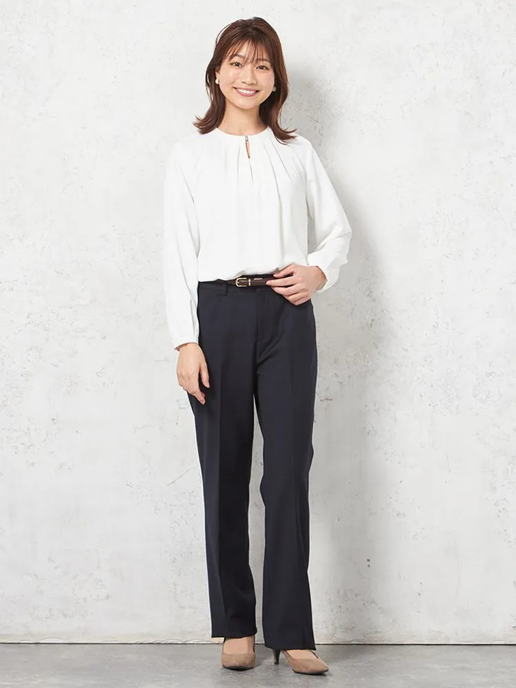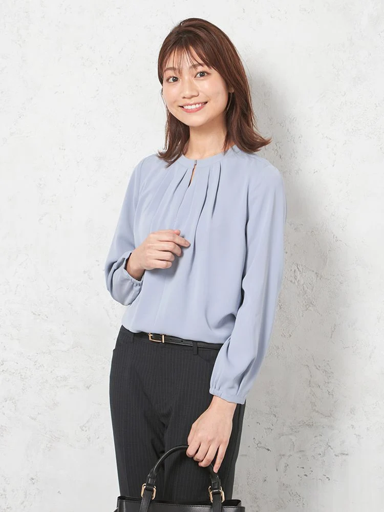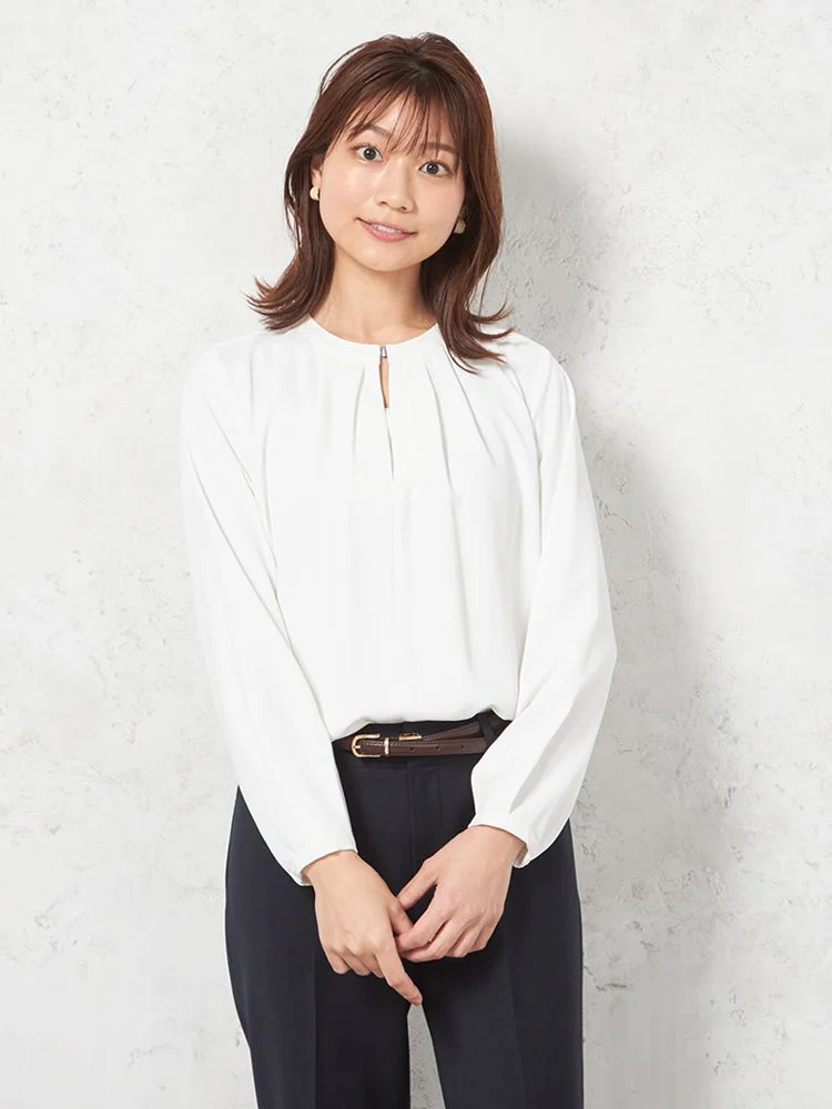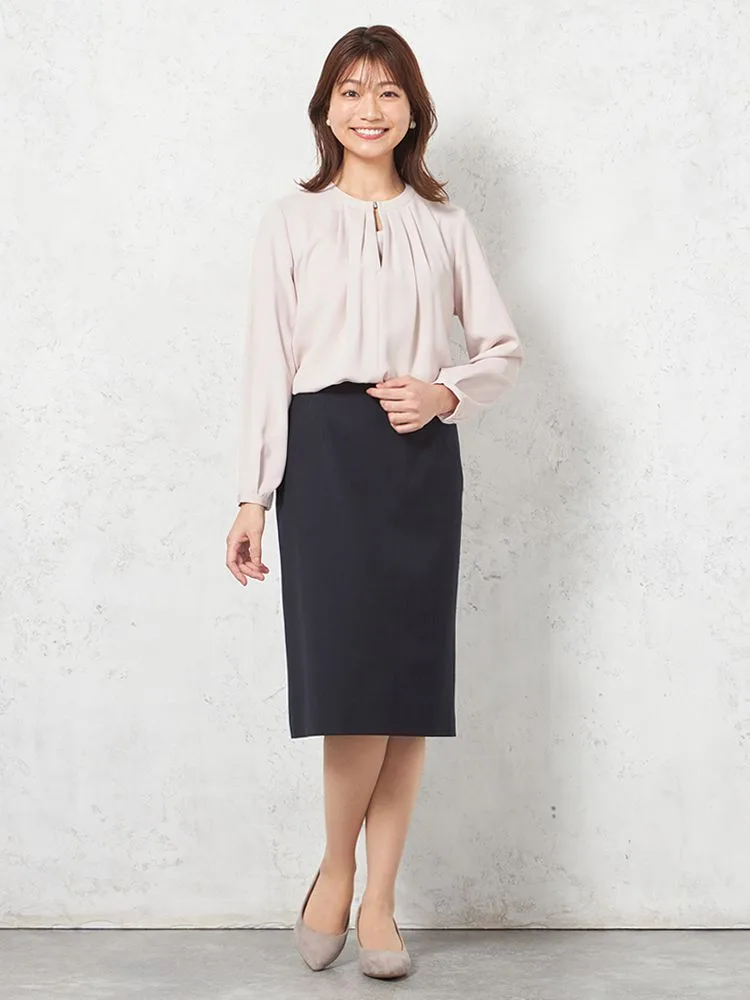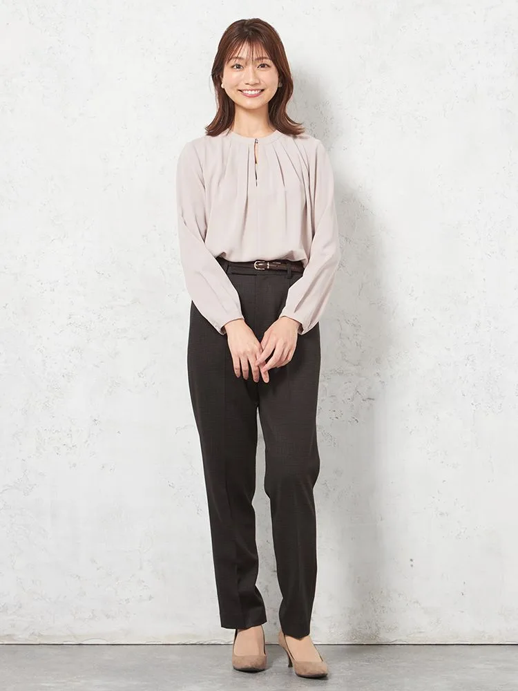 【ウォッシャブル】ブラウス 長袖 クルーネックプルオーバータックブラウス 透けにくい ストレッチ 無地 SOFFICE 通年【レディース】(ベージュ)