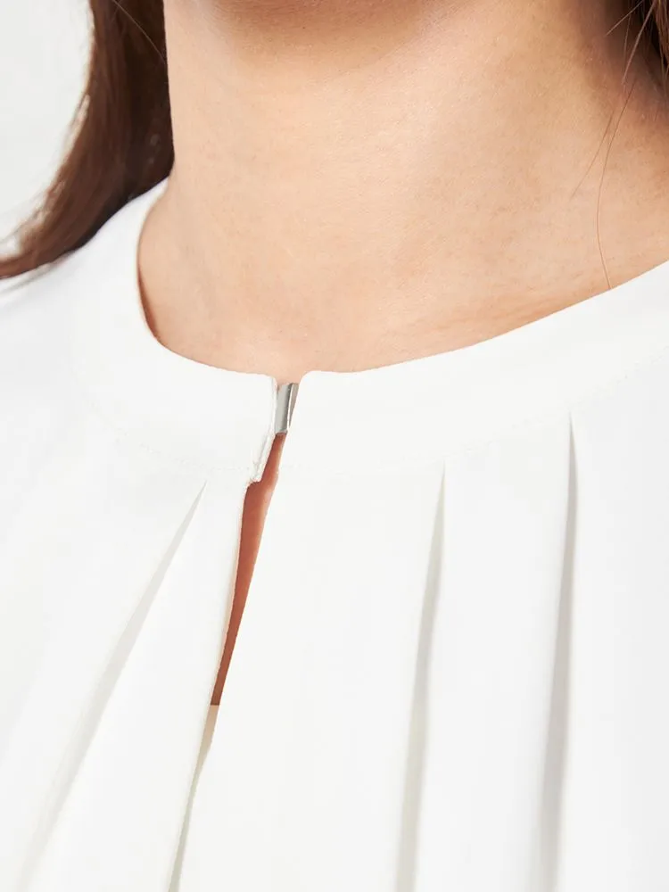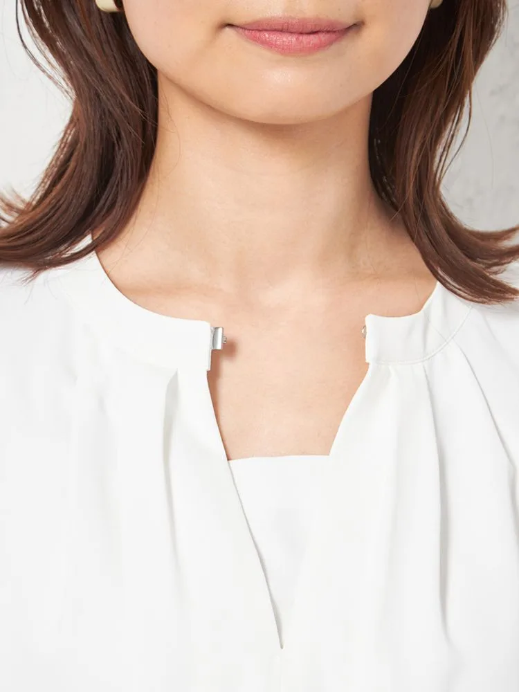 トップにシルバーのパーツをあしらったタックブラウスです。