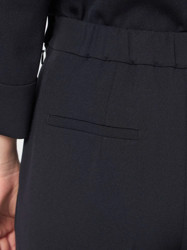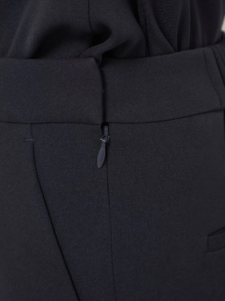 統一感あるブラックのトップス、パンツはタテヨコ伸びる2WAYストレッチ素材。