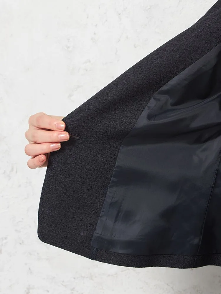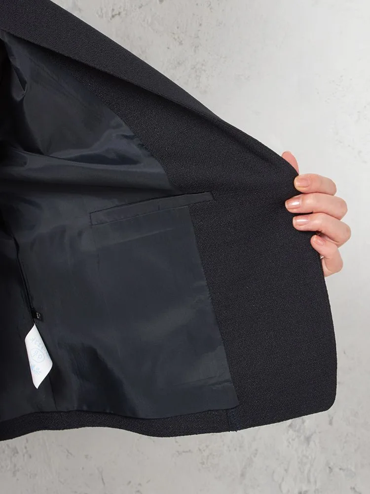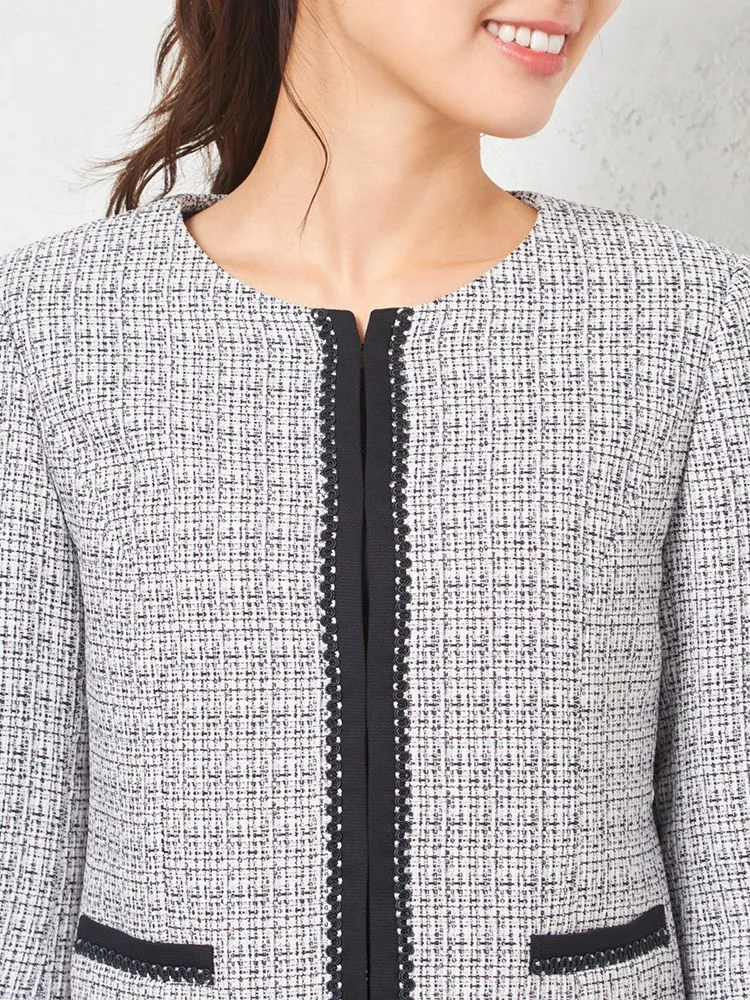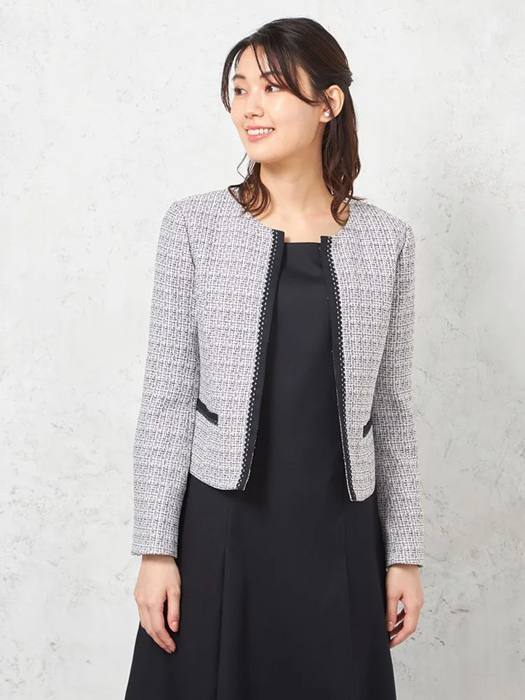 ラウンドネックノーカラージャケット と V 開きノーカラージャケット・ワンピースの 3 点セット。
