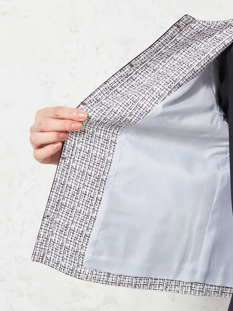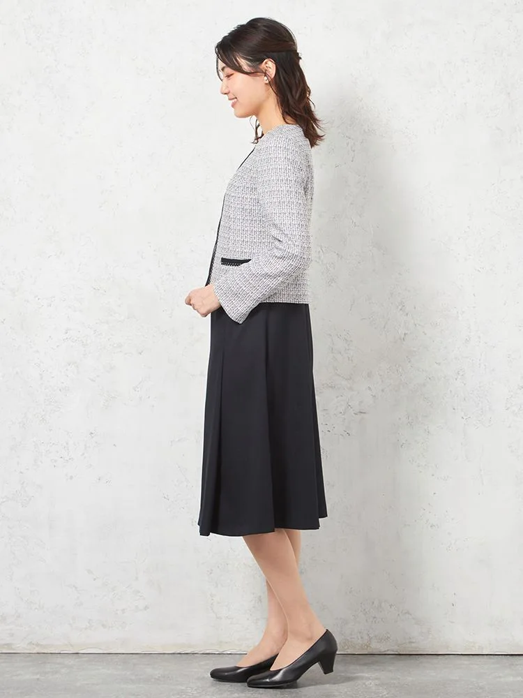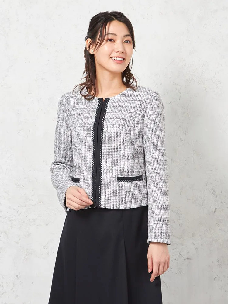 入園入学には白黒のツイードジャケットを、卒園卒業にはネイビー無地のジャケットを着用すればコーデが完成。