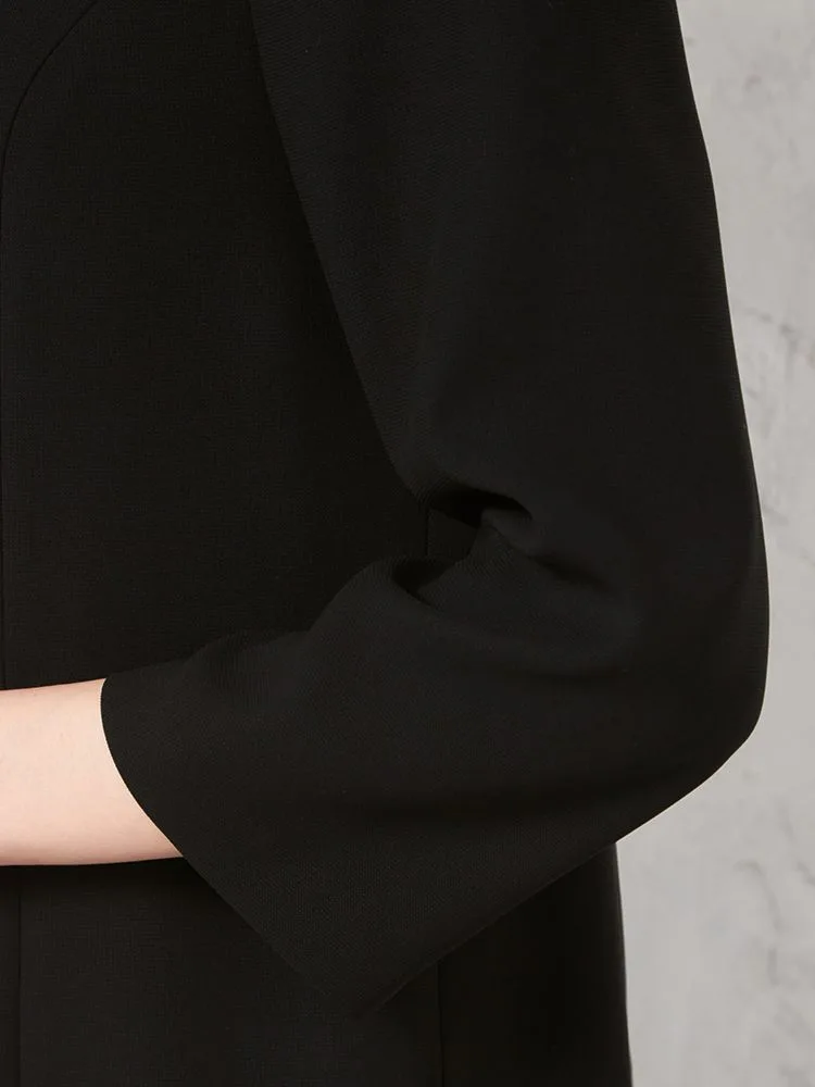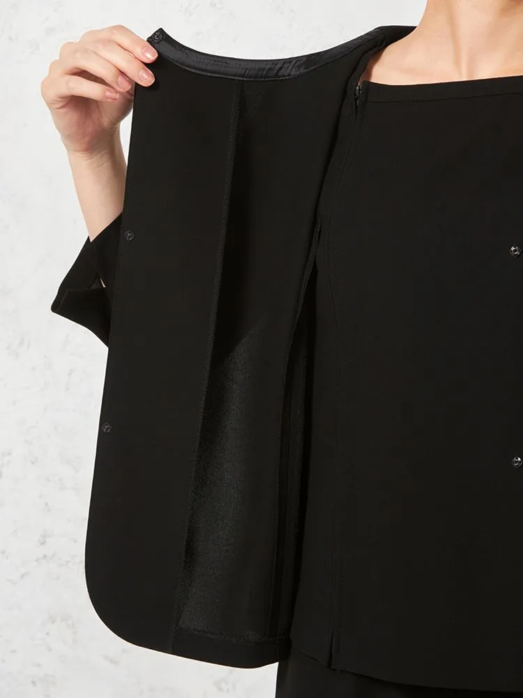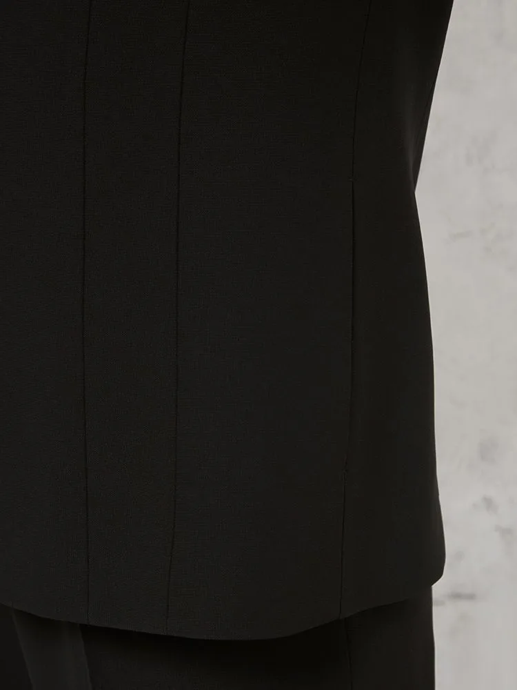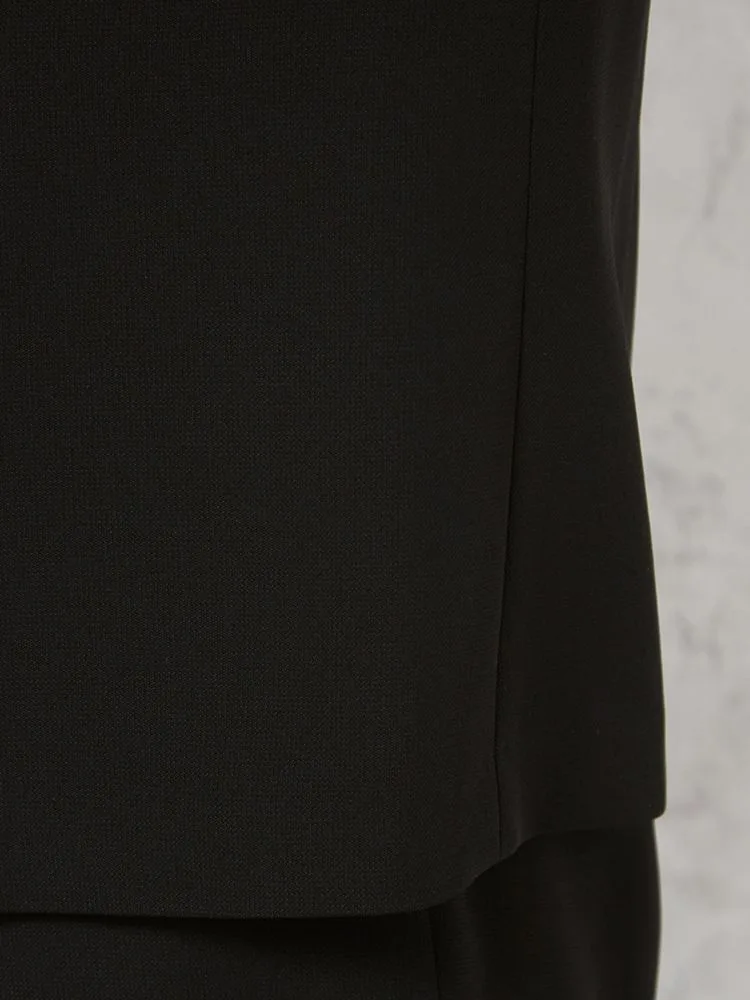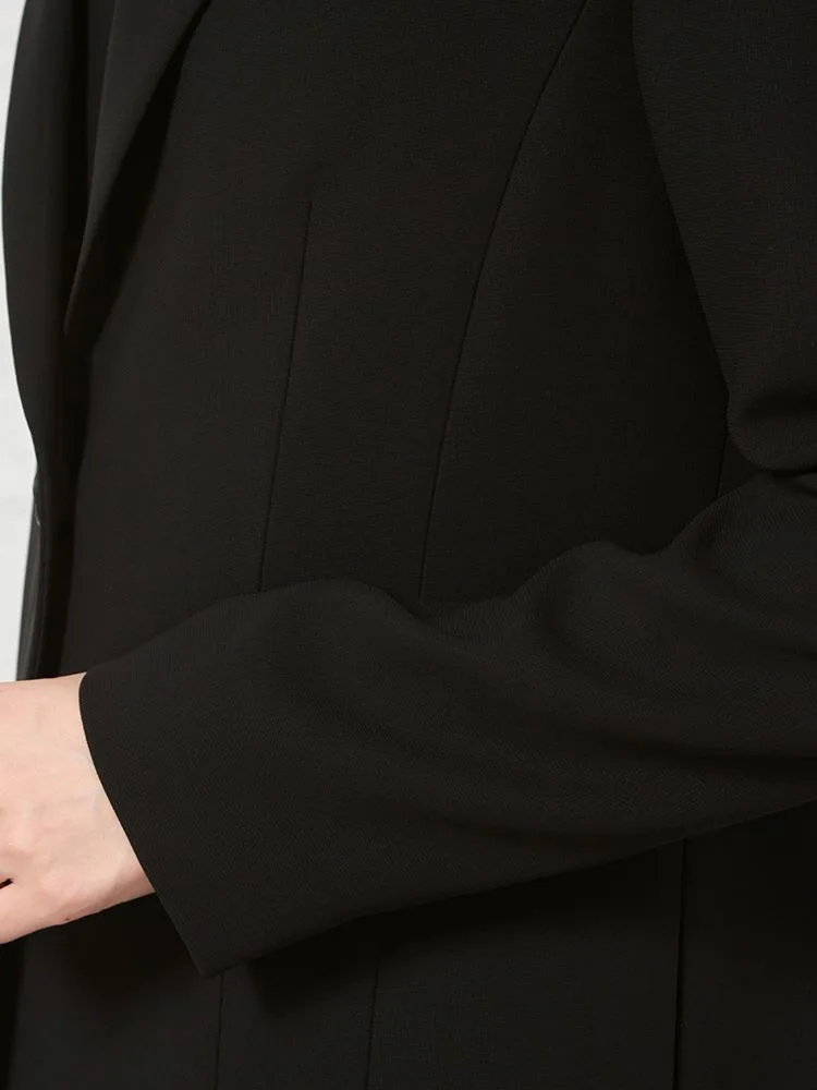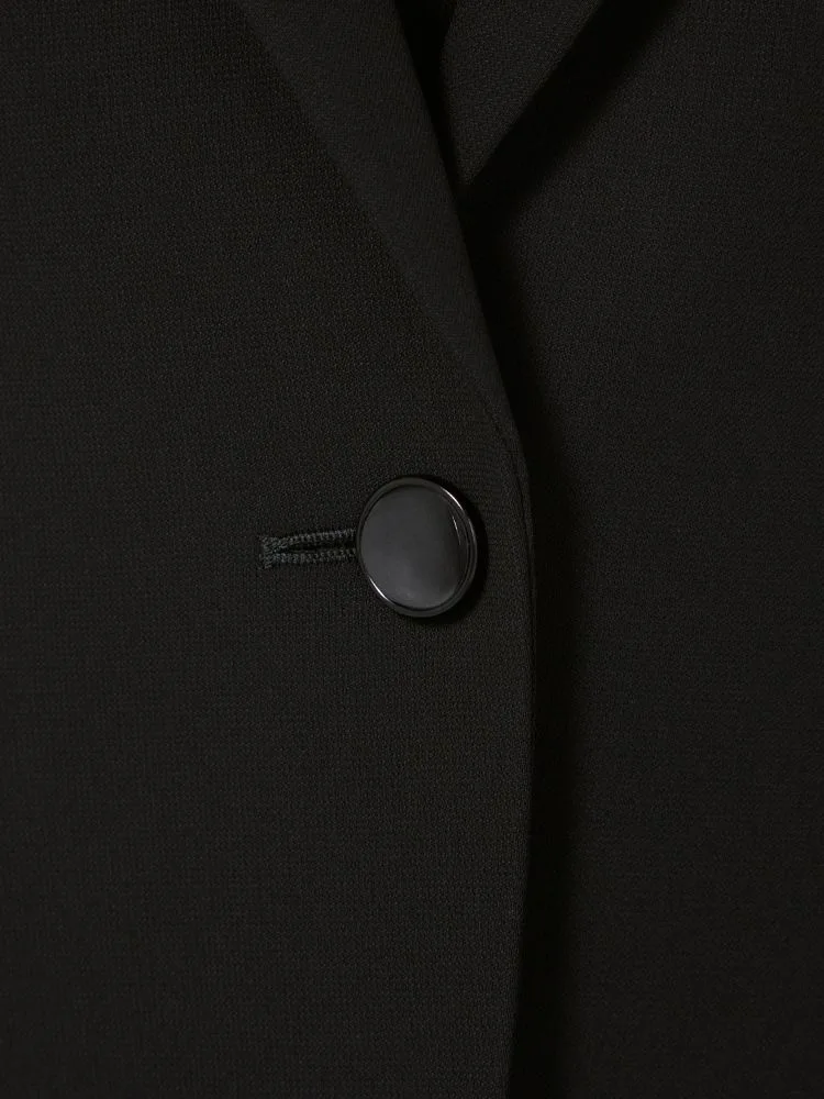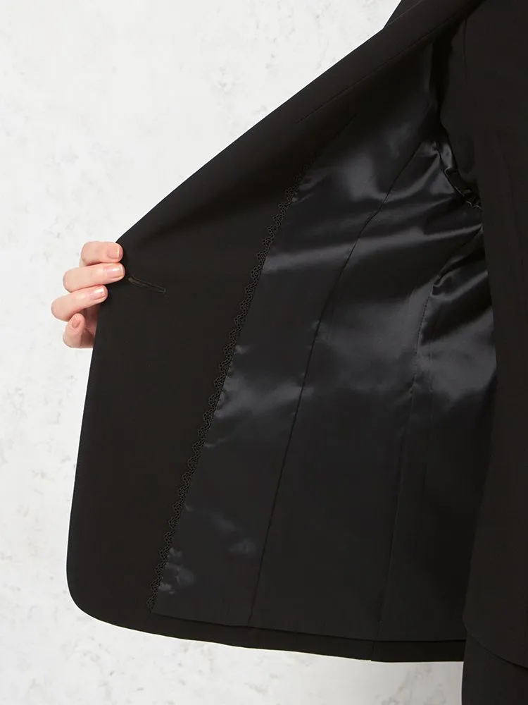 ジャケットは女性らしさをさりげなくプラスするコンパクトなワンボタンのデザイン。