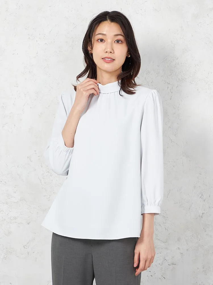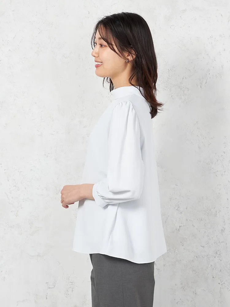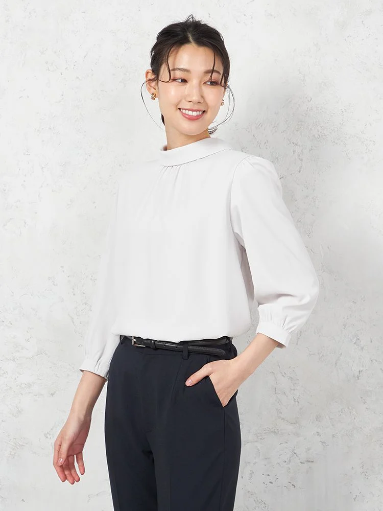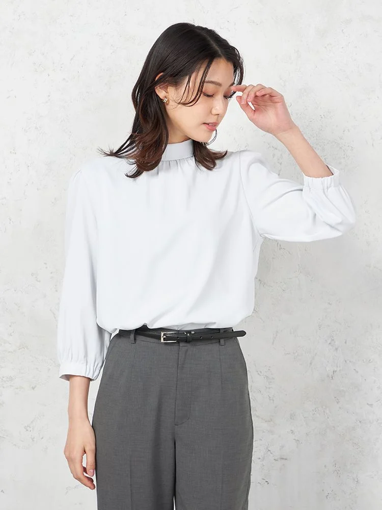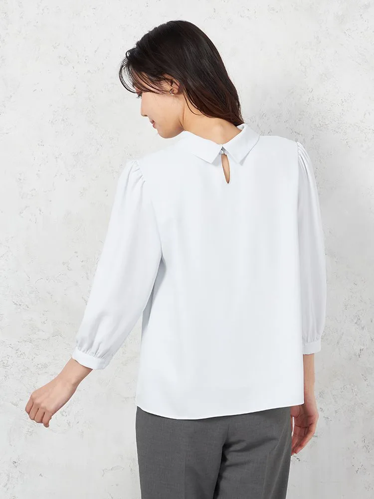 首元をロールカラー仕立てにして、凛とした雰囲気に仕上げた7分袖ブラウス。