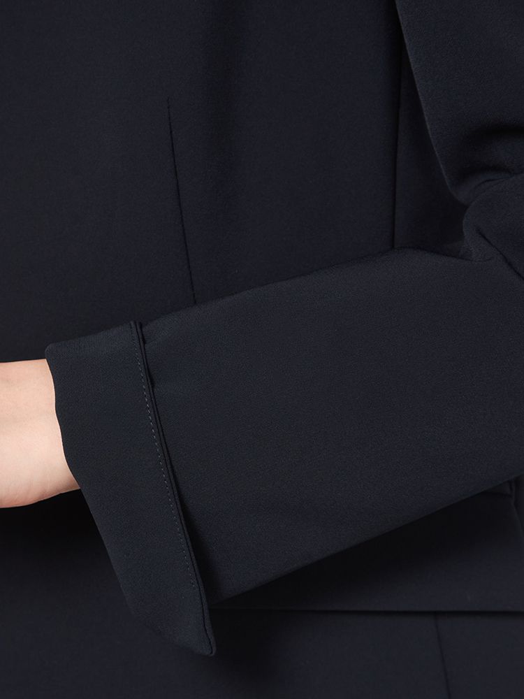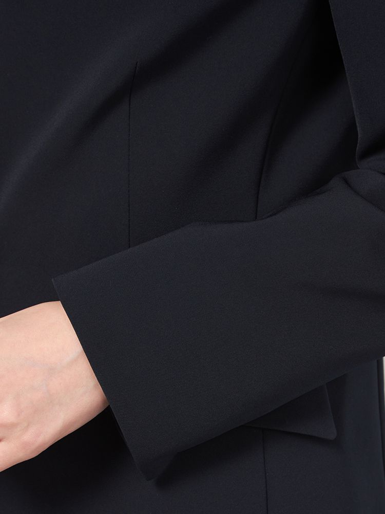 シンプルなノーカラージャケットは、立体的なフォルムを構築できるよう少し張りのある素材を採用。
