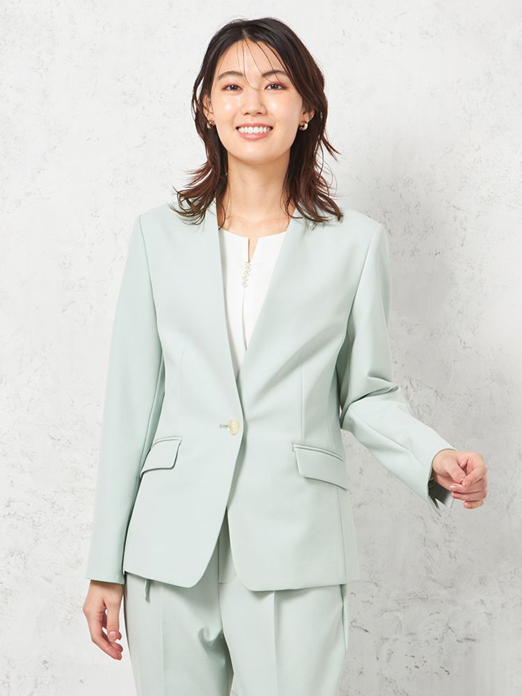【ウォッシャブル】ノーカラージャケット ストレッチ【ビジネス/セレモニーシーン】無地 SOFFICE 通年【レディース】(L.グリーン)