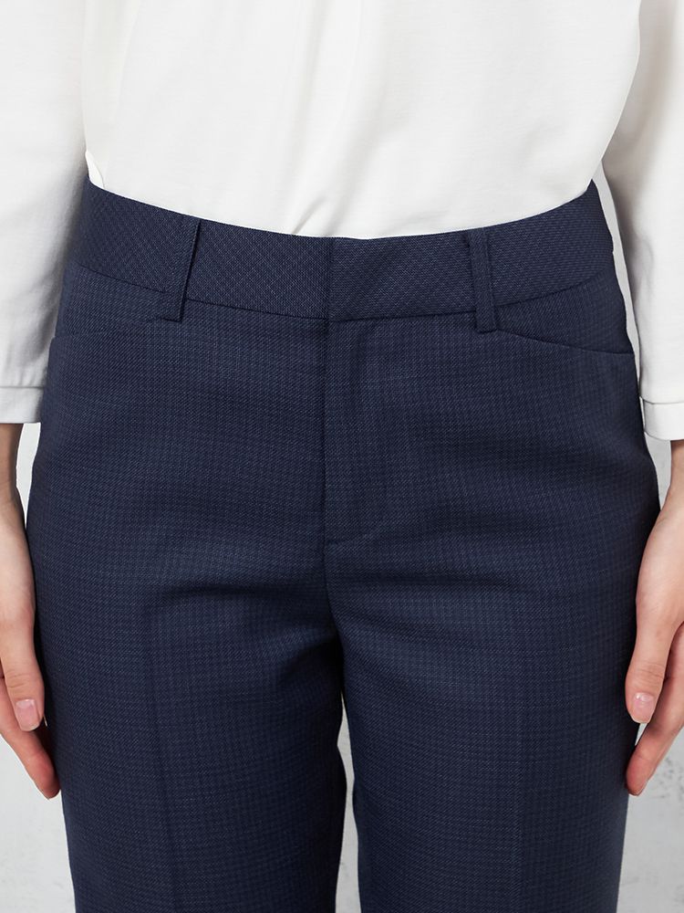 パンツの腰回りに生地の折り込みがなく、スッキリとしたシルエットを実現します。シンプルで洗練された印象を与え、すっきりとした着こなしが可能です。