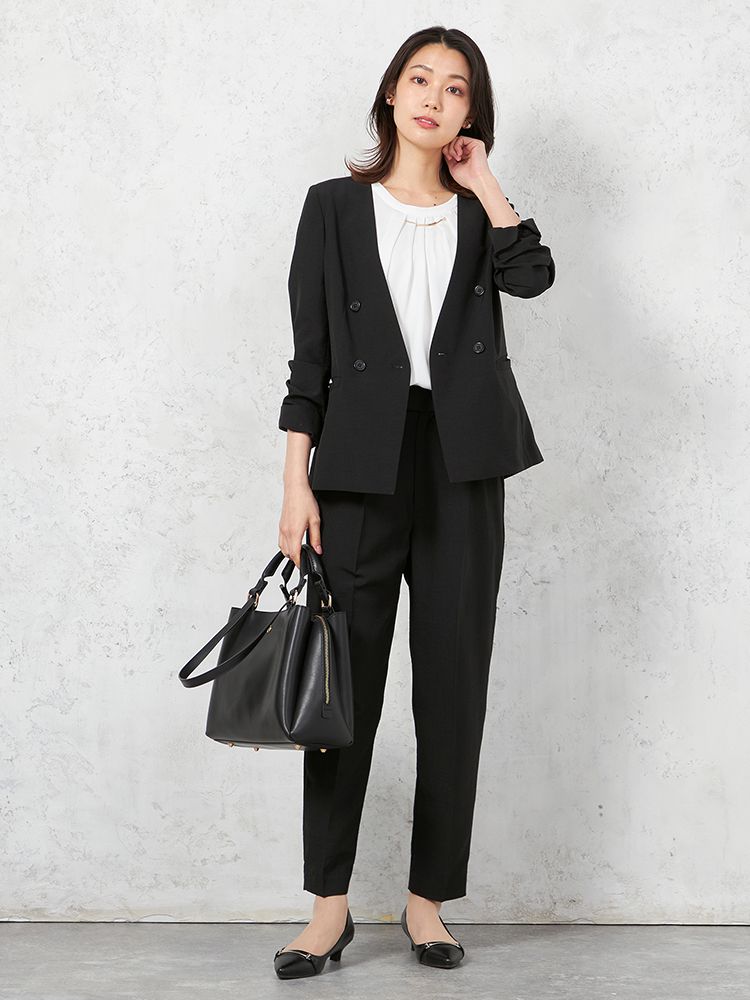 夏らしい軽やかなリネンライク素材を使用したノーカラーダブルボタンジャケットです。