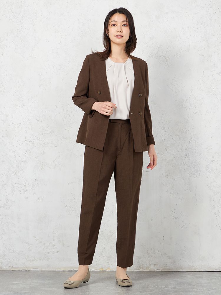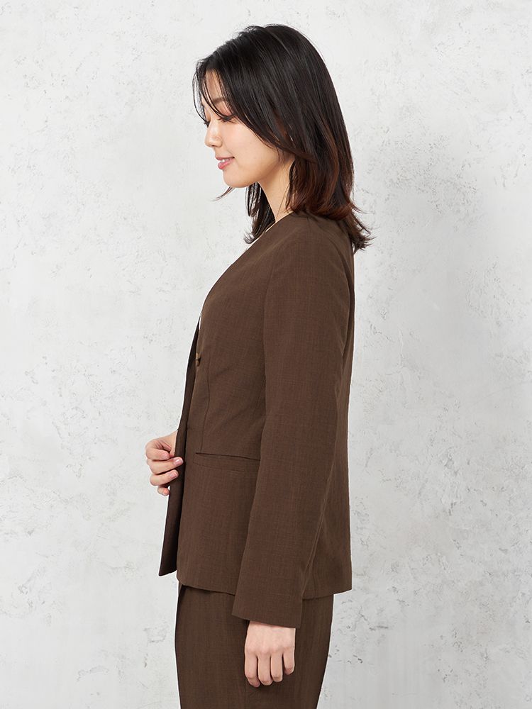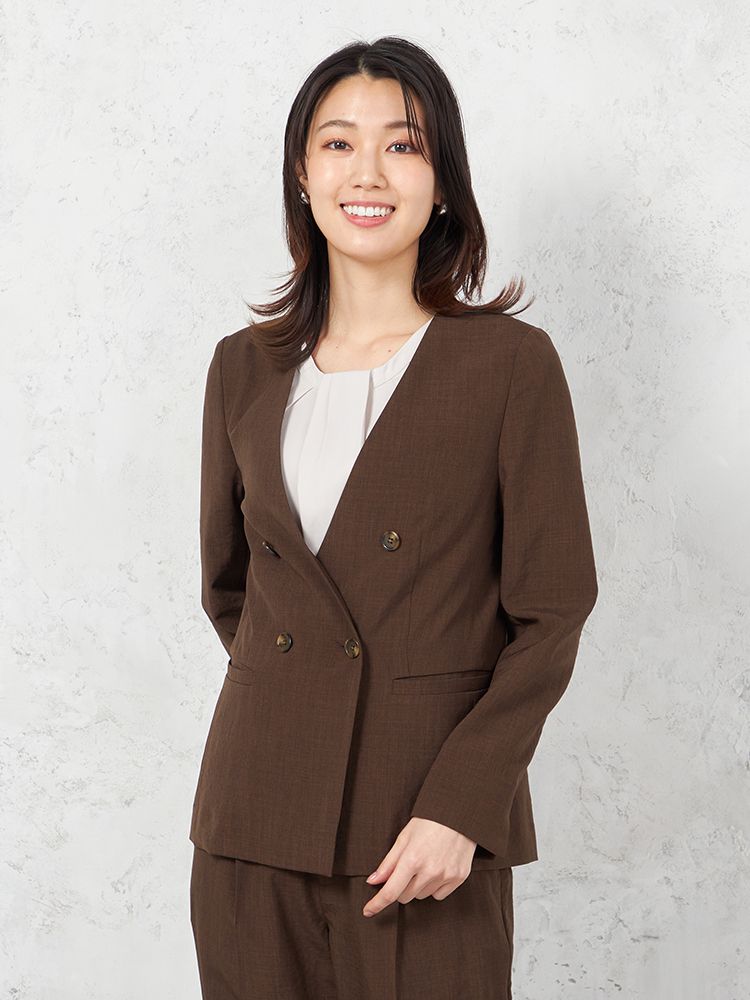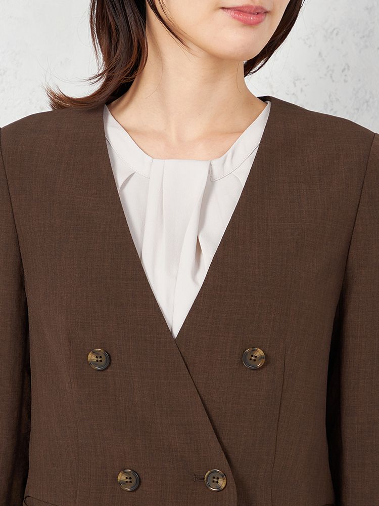 【ウォッシャブル】ノーカラーダブルジャケット リネンライクメランジ生地 無地 SOFFICE 春夏【レディース】(ブラウン)