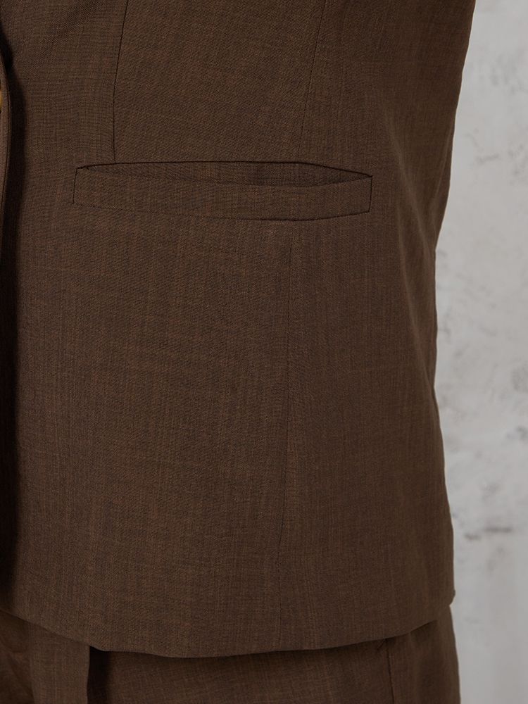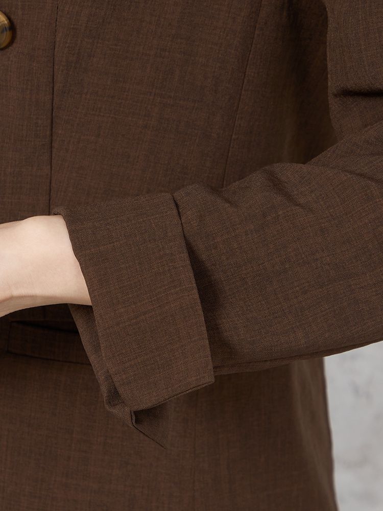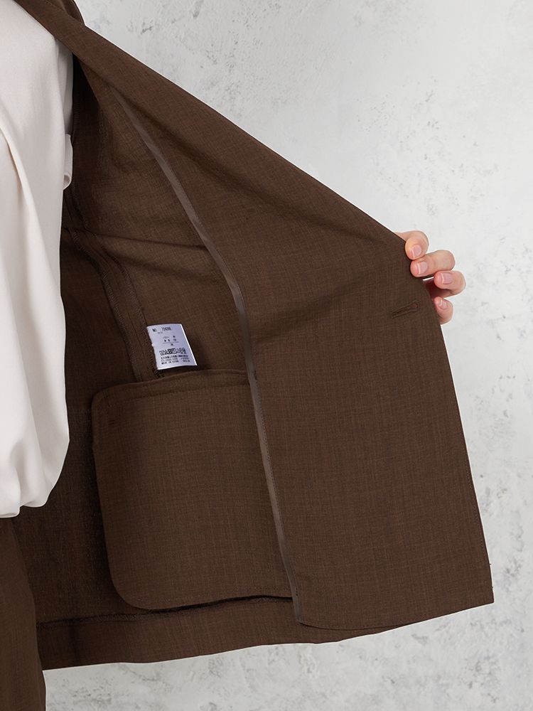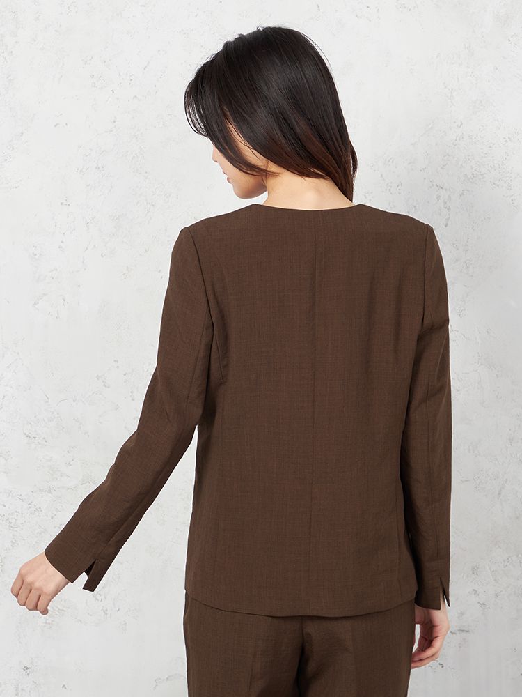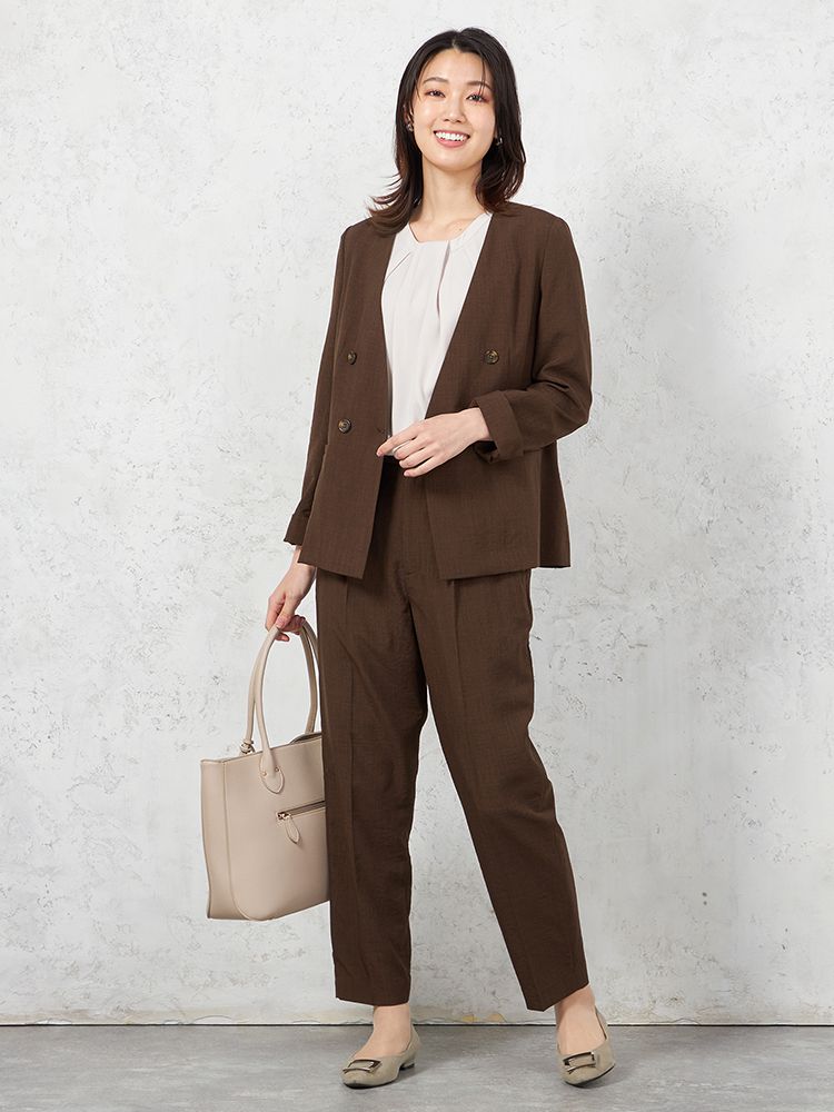 【ウォッシャブル】ノーカラーダブルジャケット リネンライクメランジ生地 無地 SOFFICE 春夏【レディース】(ブラウン)