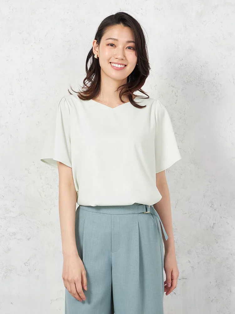 さりげなく可愛らしさをプラスできるハートネックのブラウスです。