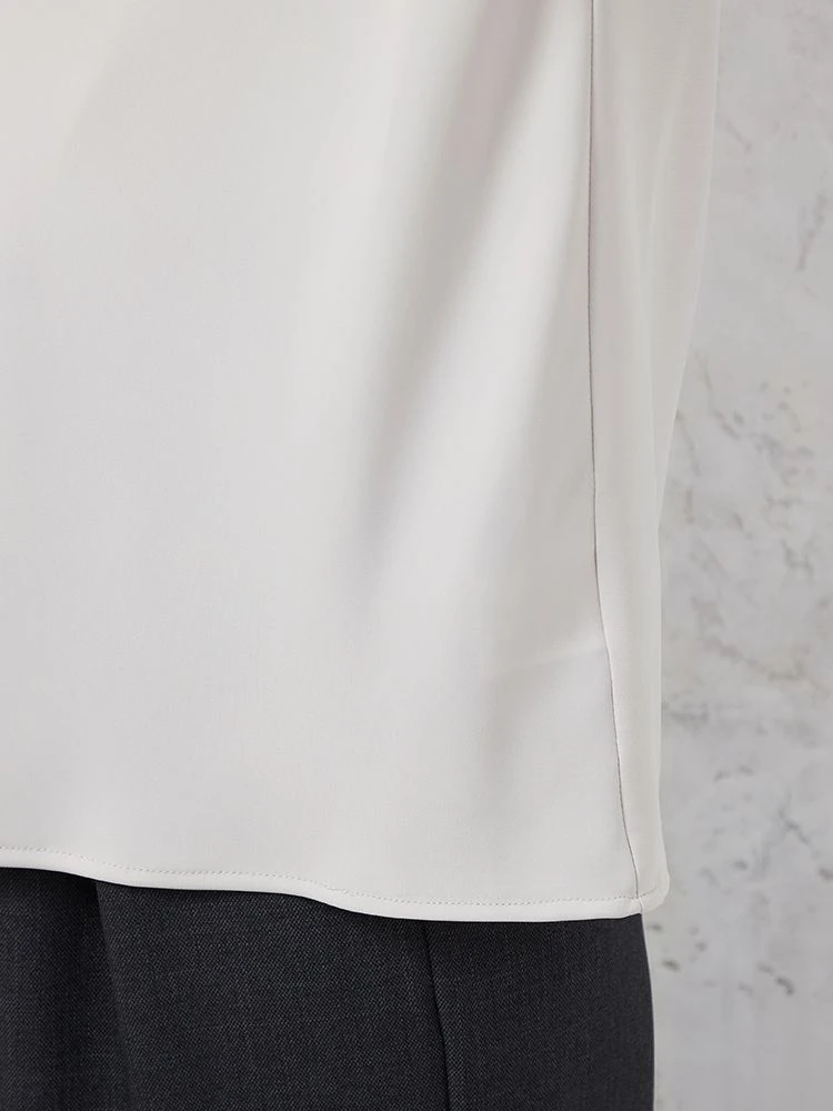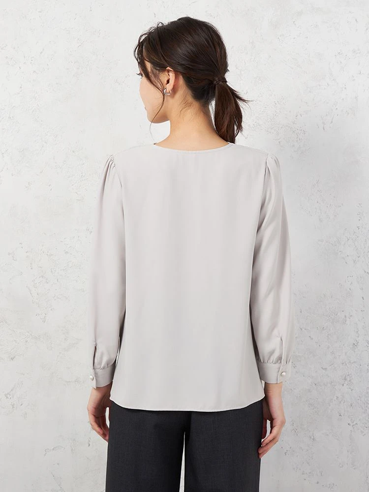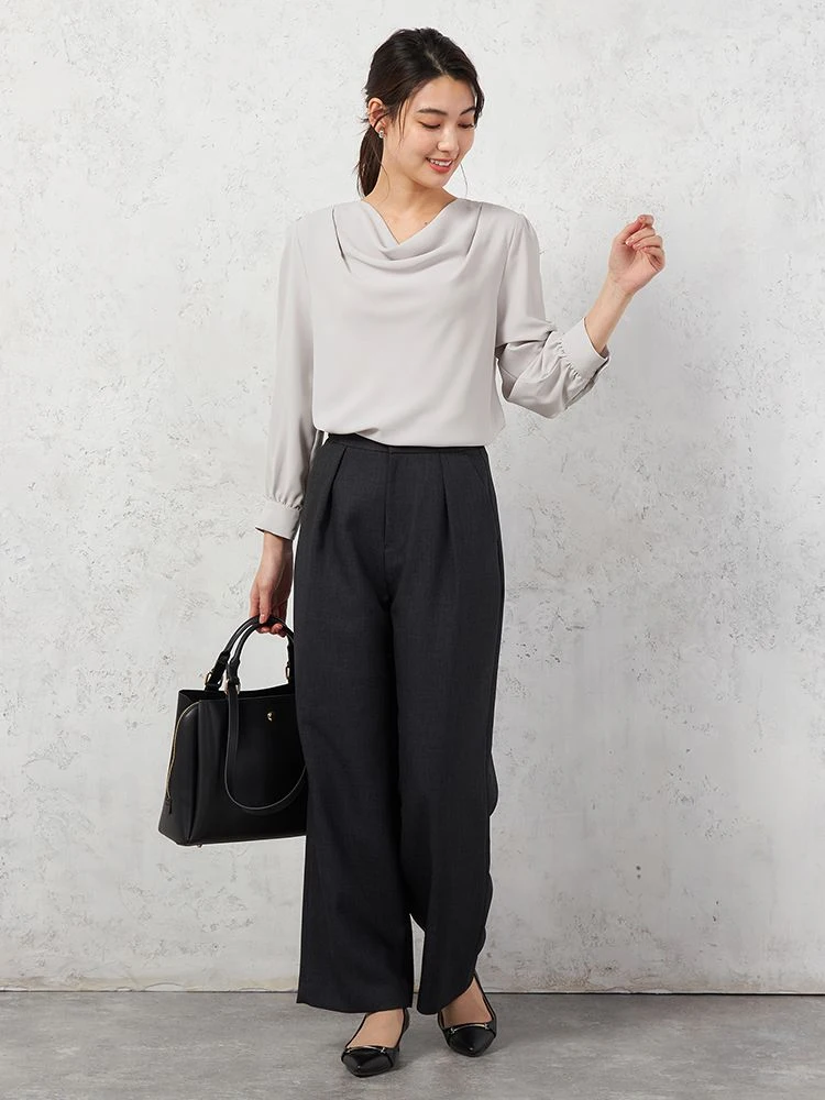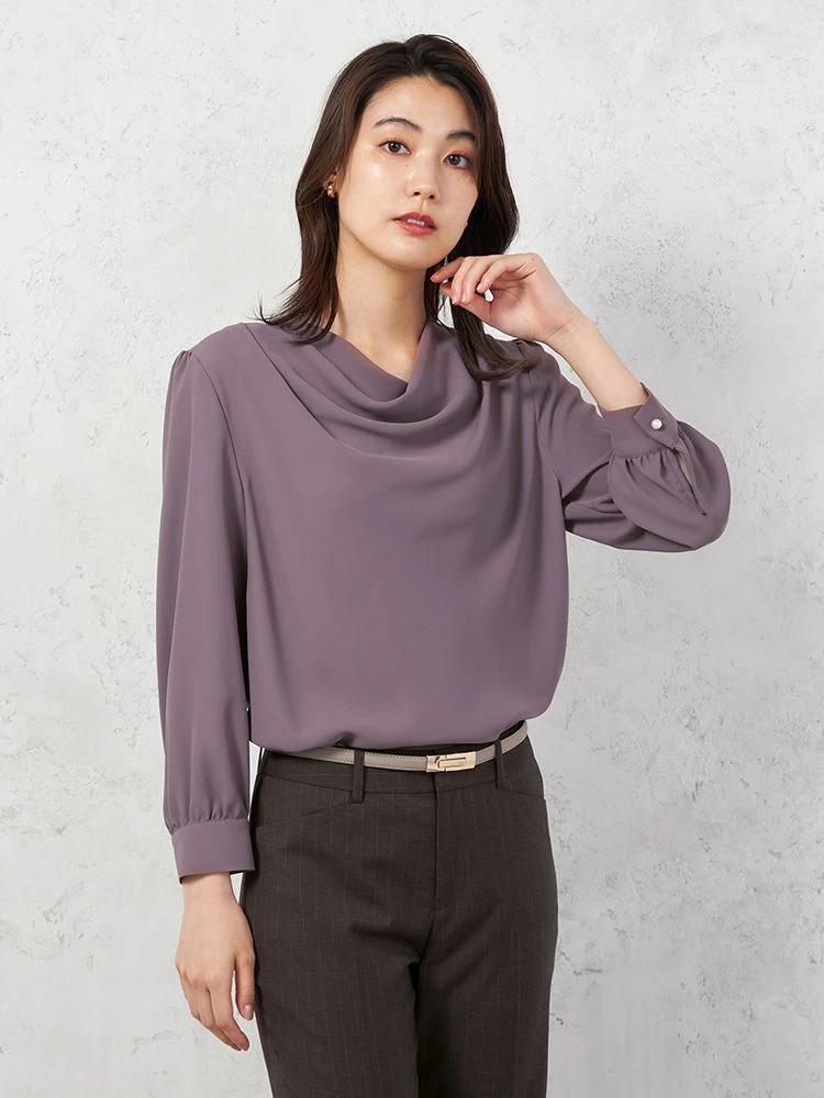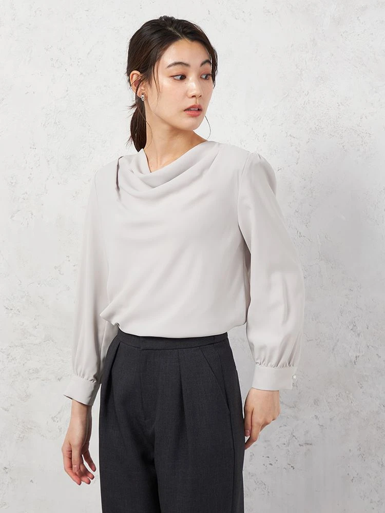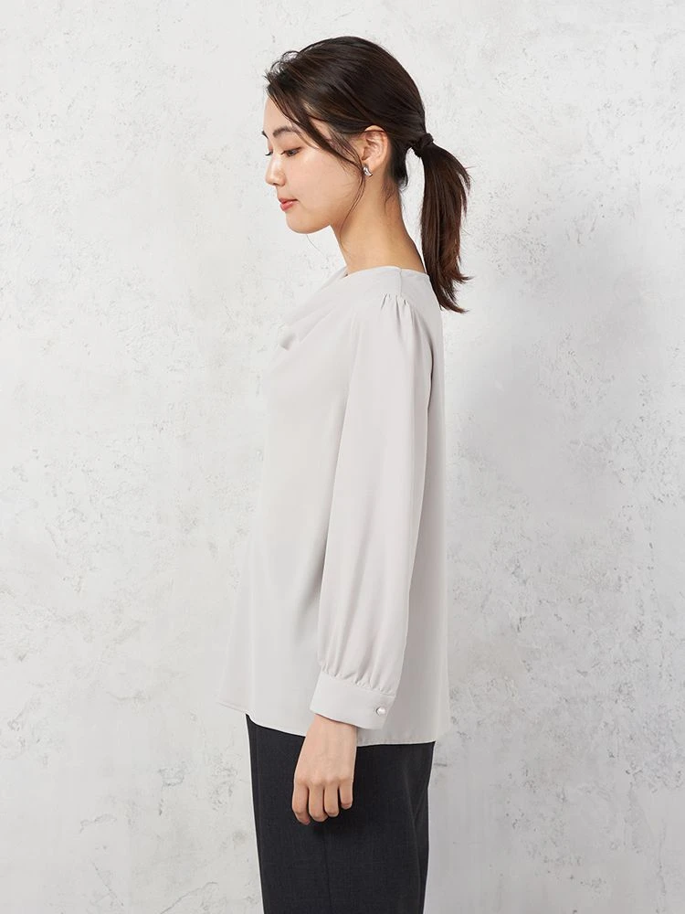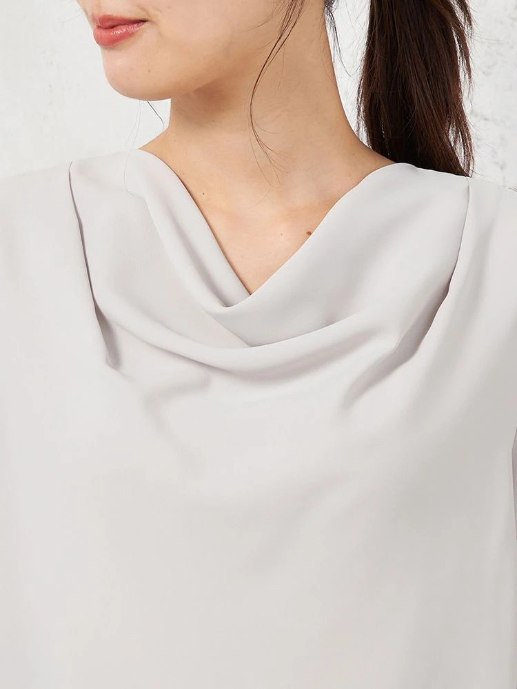 顔まわりやデコルテをやわらかく包むようなドレープネックがエレガントなブラウス。