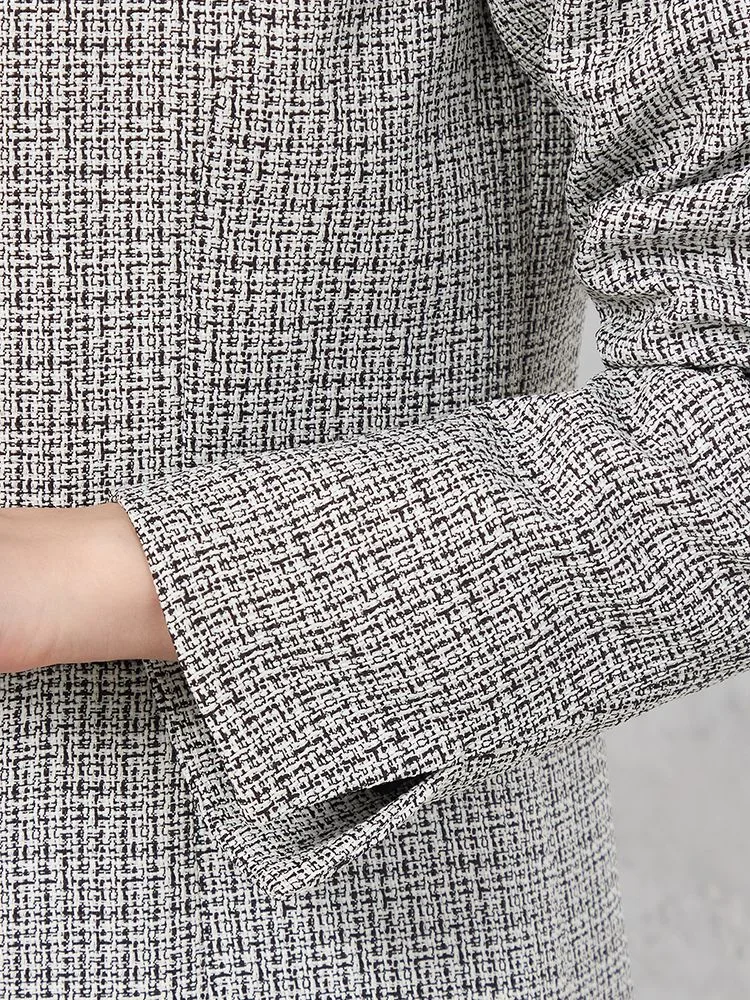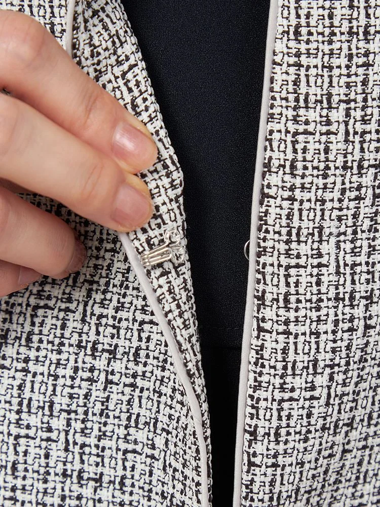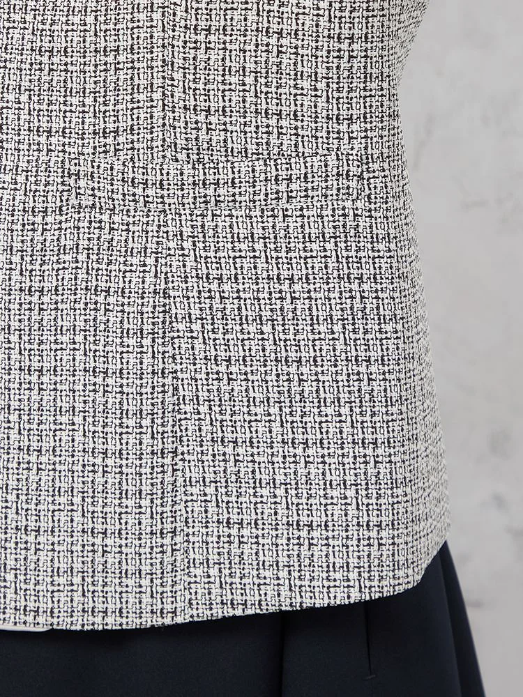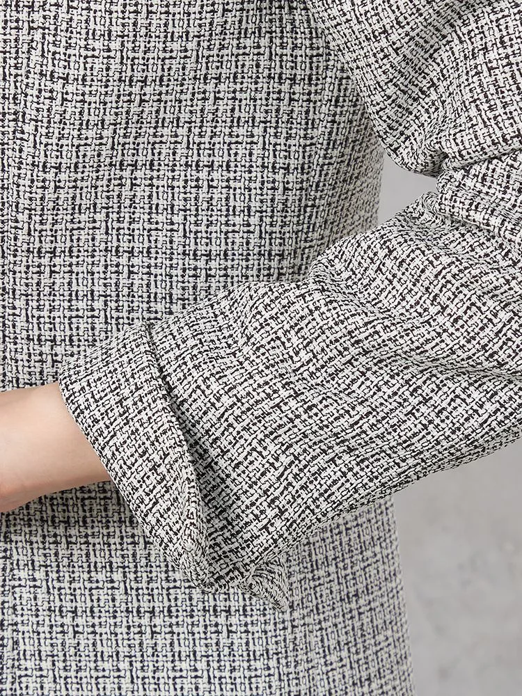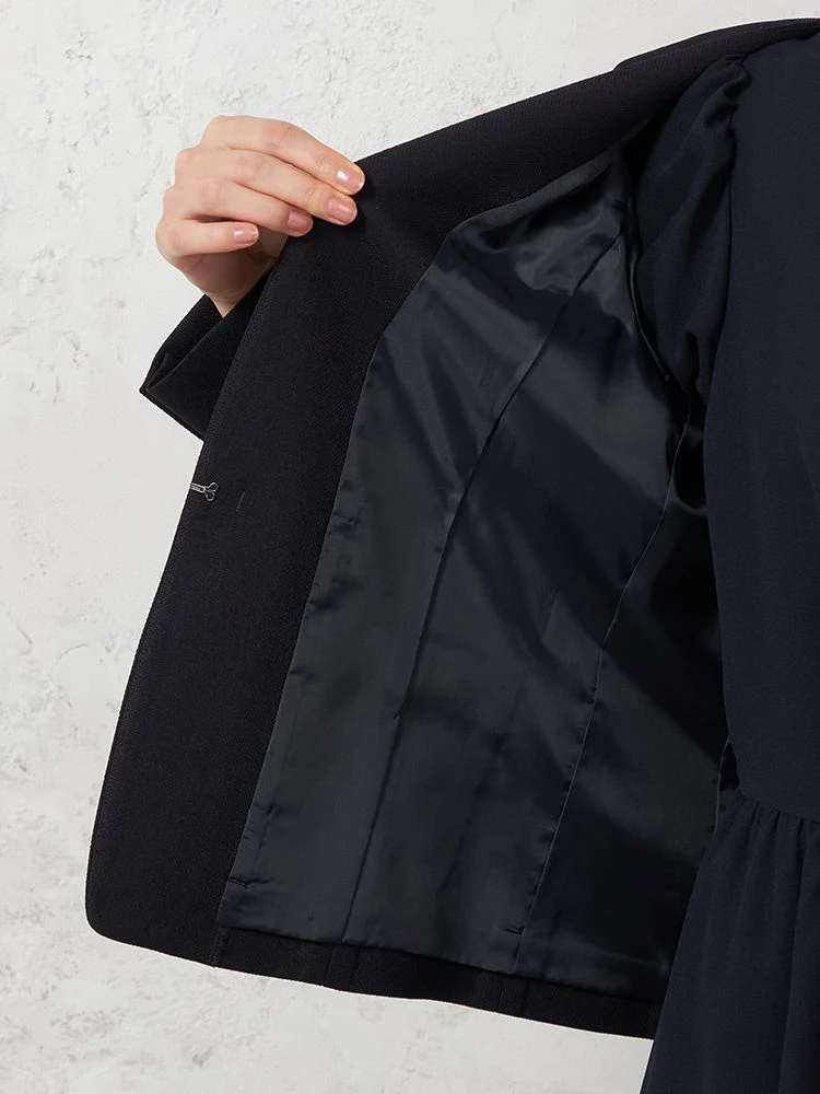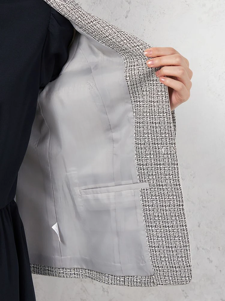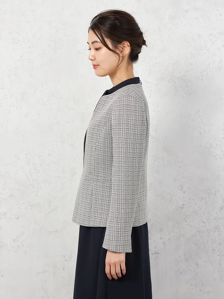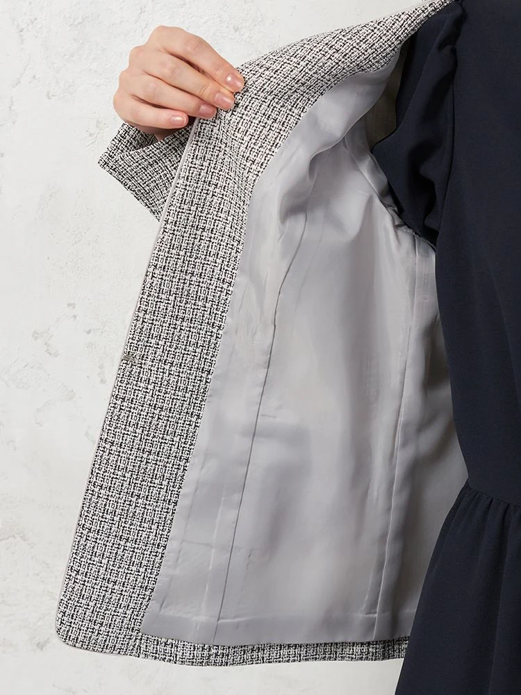 フェミニンで上品なジョーゼット素材のワンピースに、華やかさのあるツイード調ジャケット、