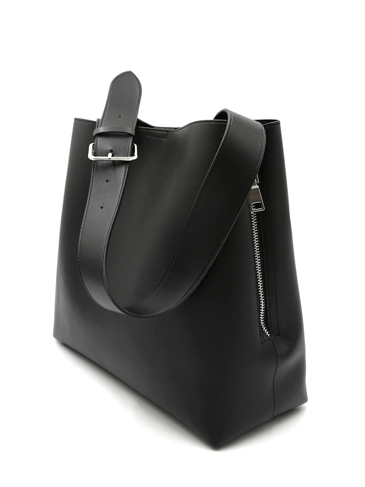 サイドのファスナーがデザインのポイントになっており開閉で容量サイズが変更できます。