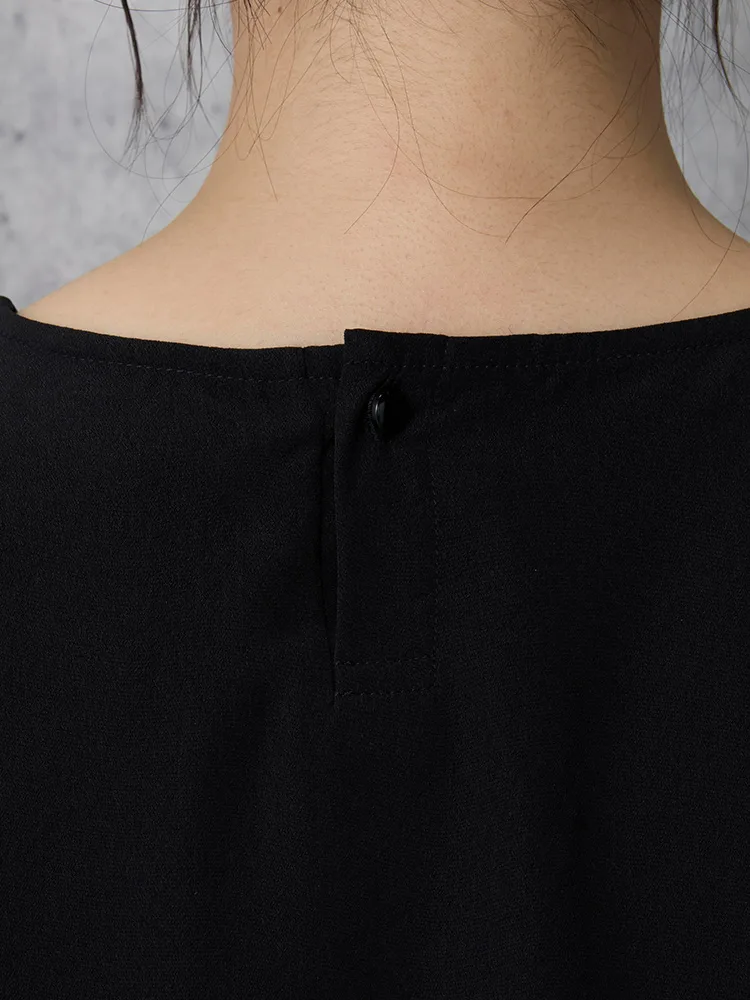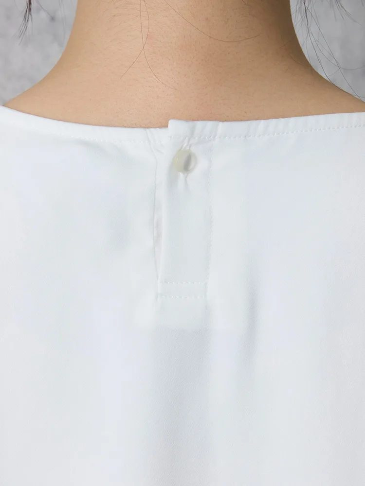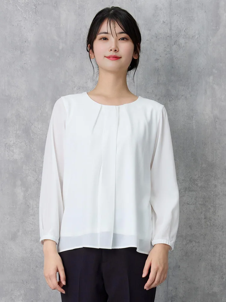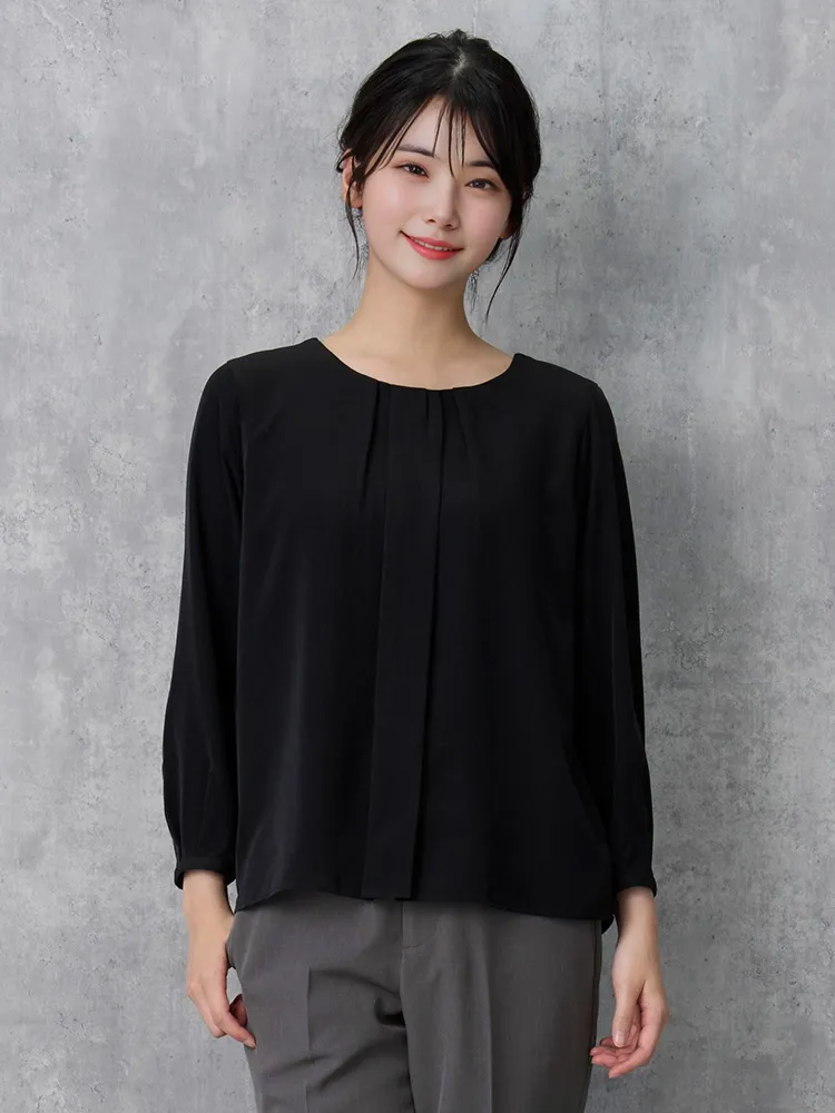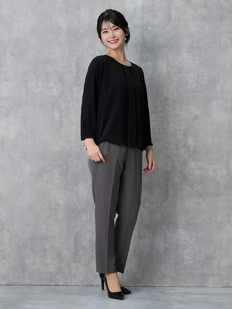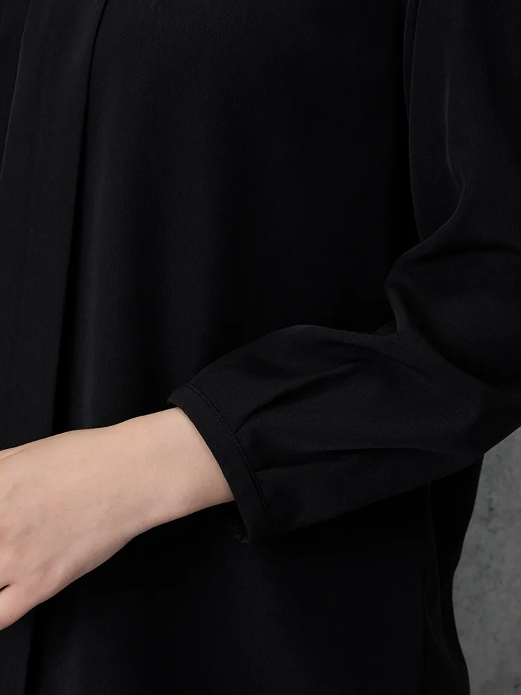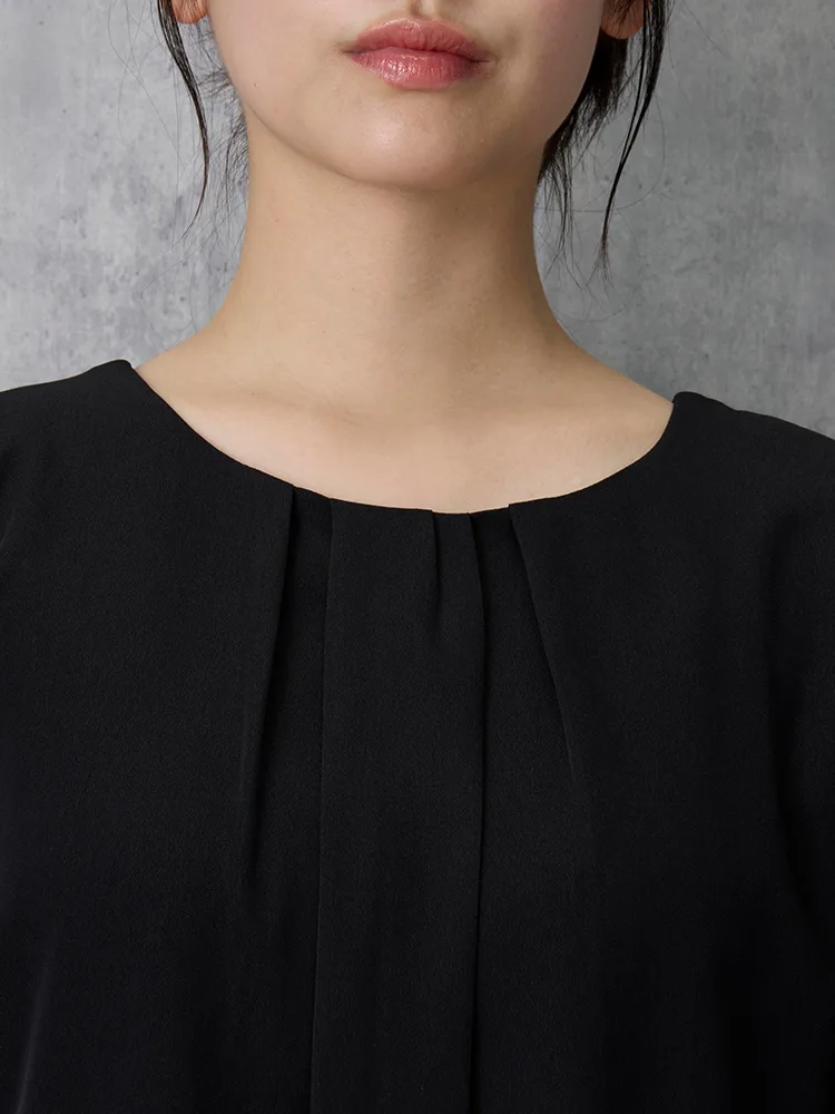 フロントのタックディテールで美しいドレープを演出した2枚仕立ての8分袖ブラウス。