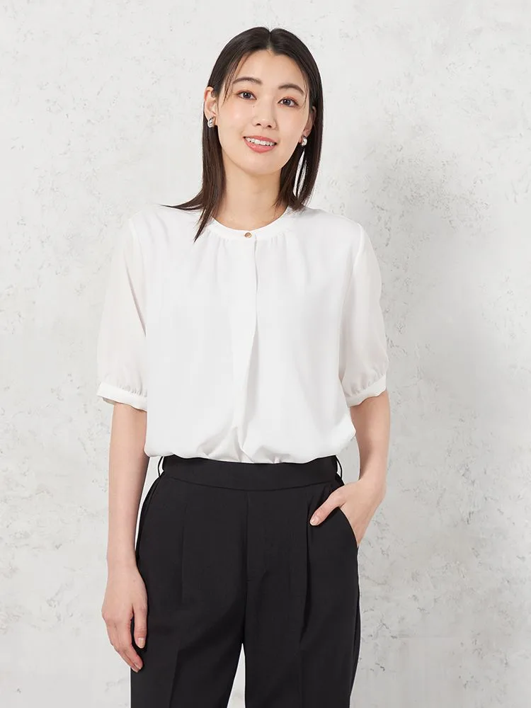 【透けにくい】ブラウス5分袖ハイネックタックデザイン無地SOFFICE春夏【レディース】