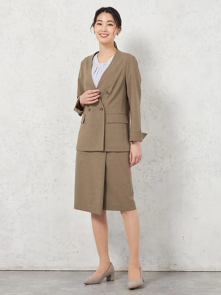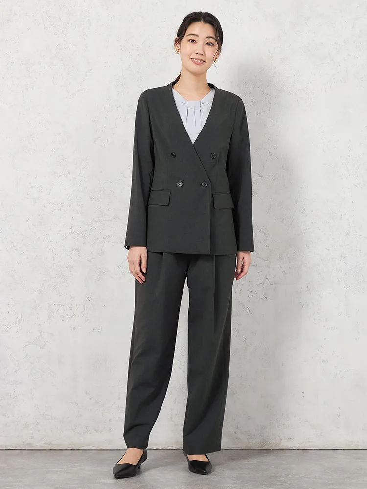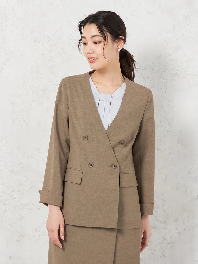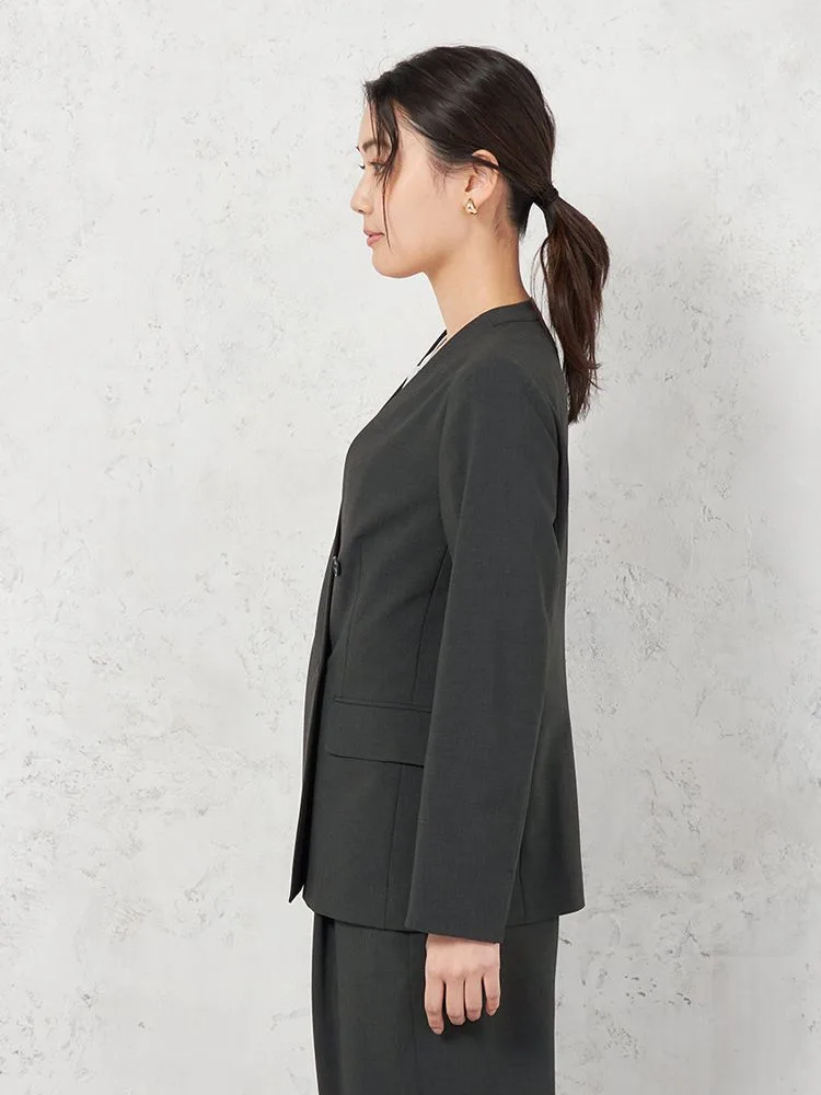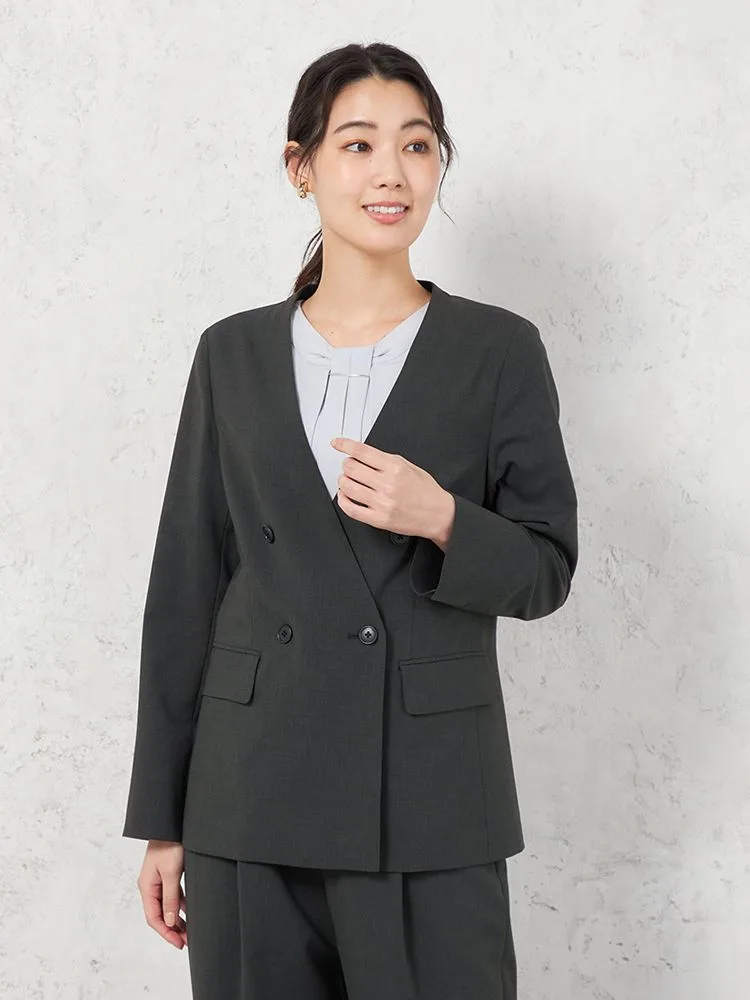 首元がすっきりとシャープなイメージのあるカラーレスのダブルジャケットは着心地の良いリラックスシルエット。