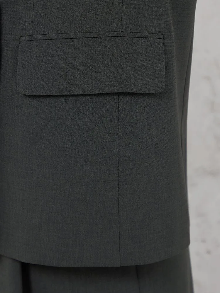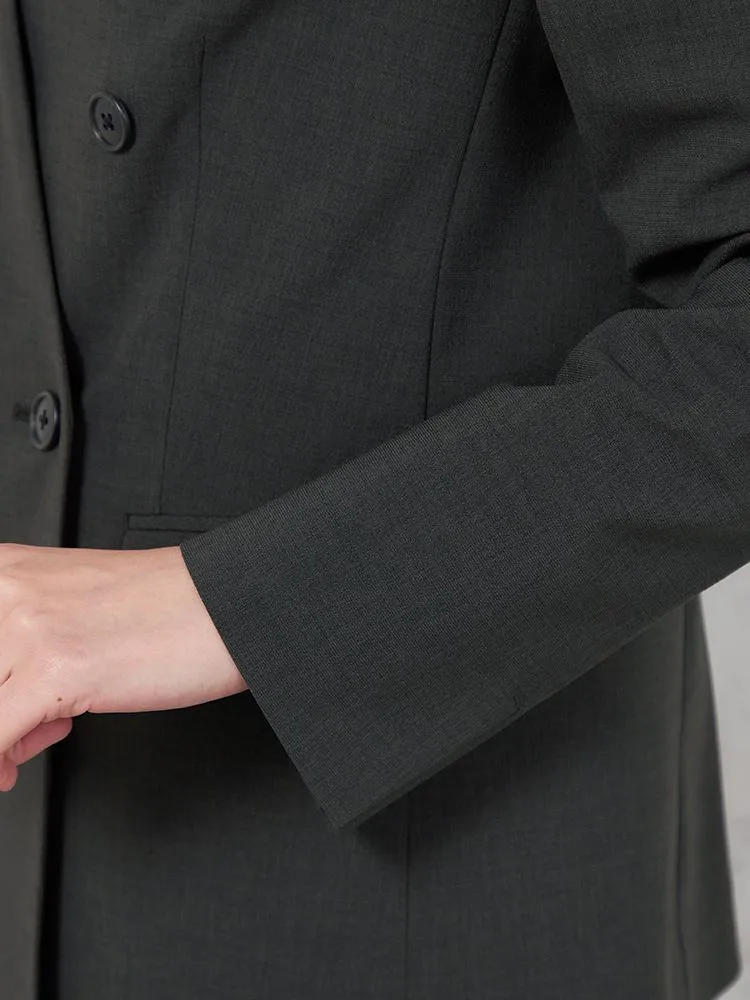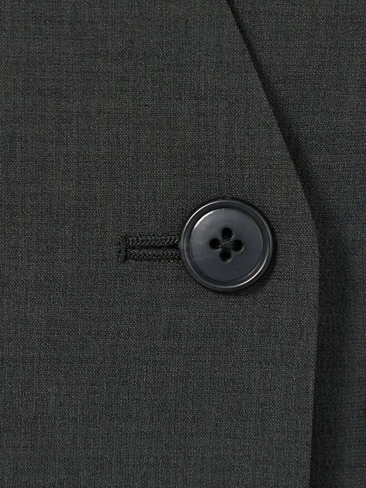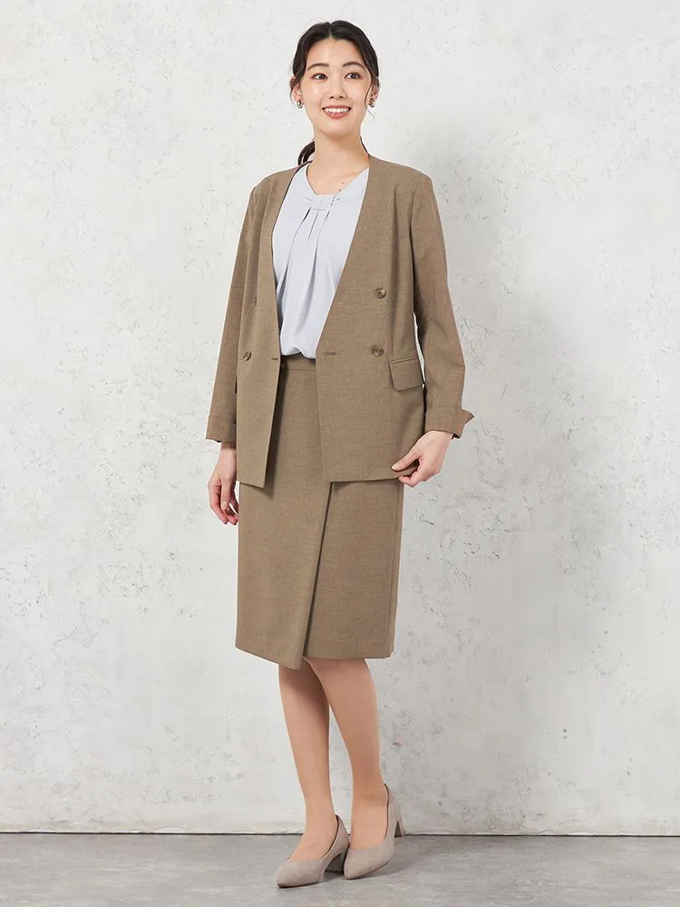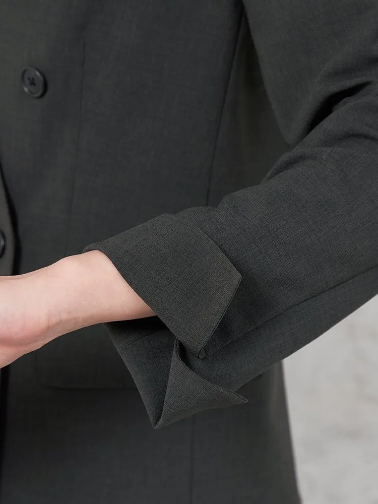 Wボタンできちんとクラシカルな雰囲気をプラス、ボタンを開けても広がらない細身のシルエットにこだわりました。