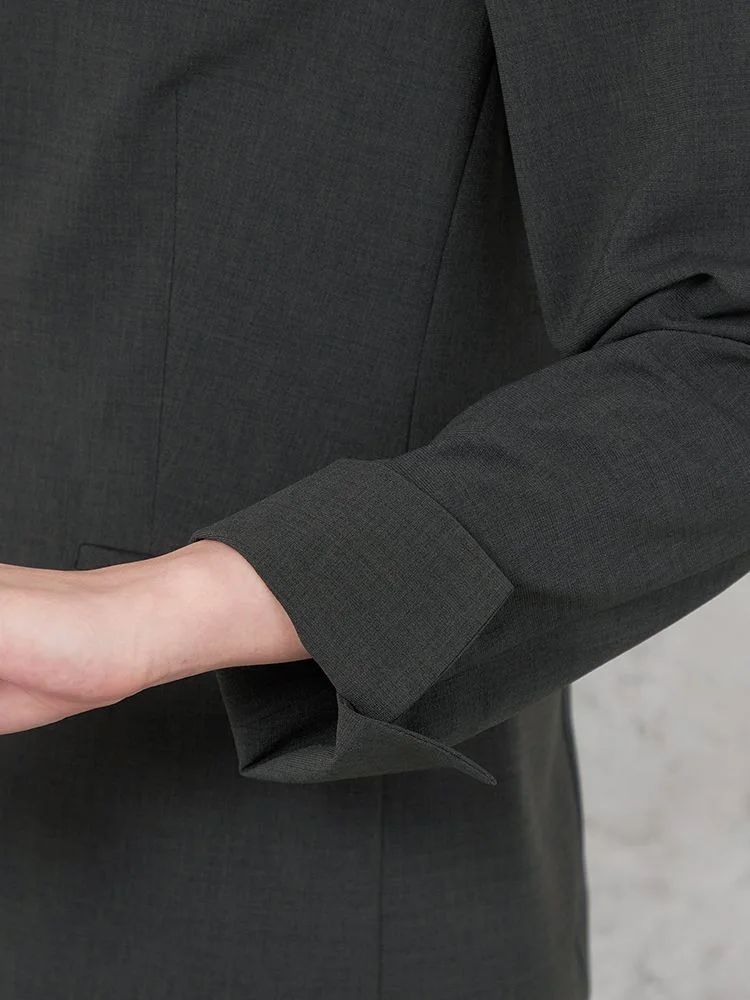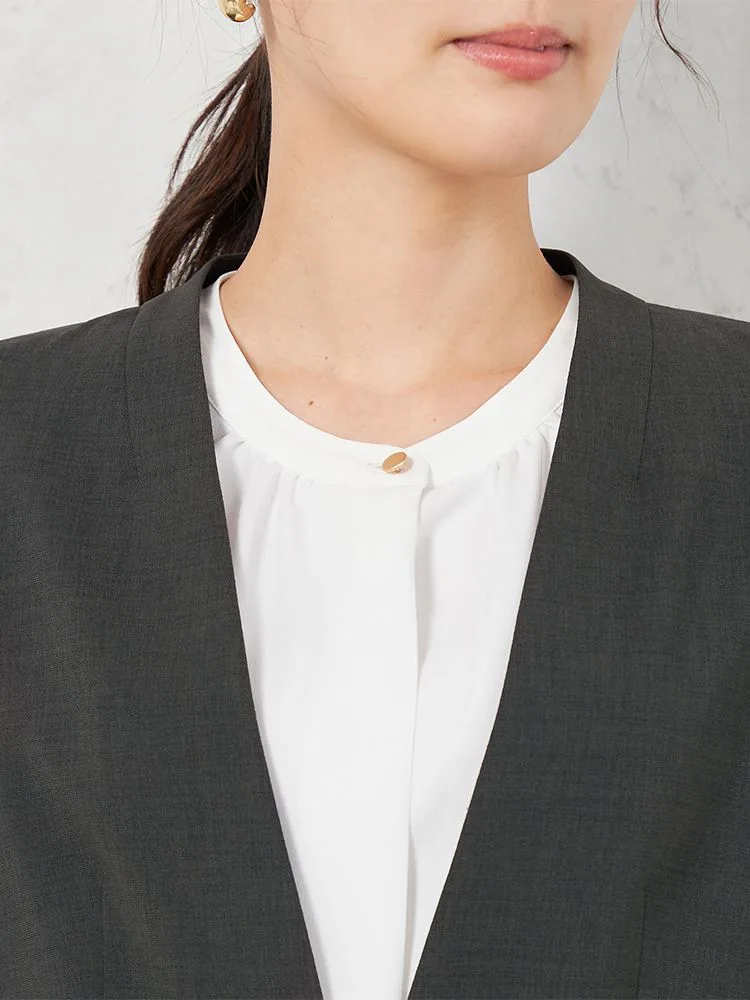 後ろネックは立ち上がりのある衿腰切替にてノーカラーでも端正な印象になっています。