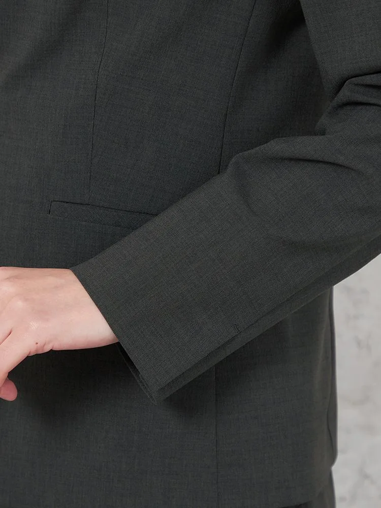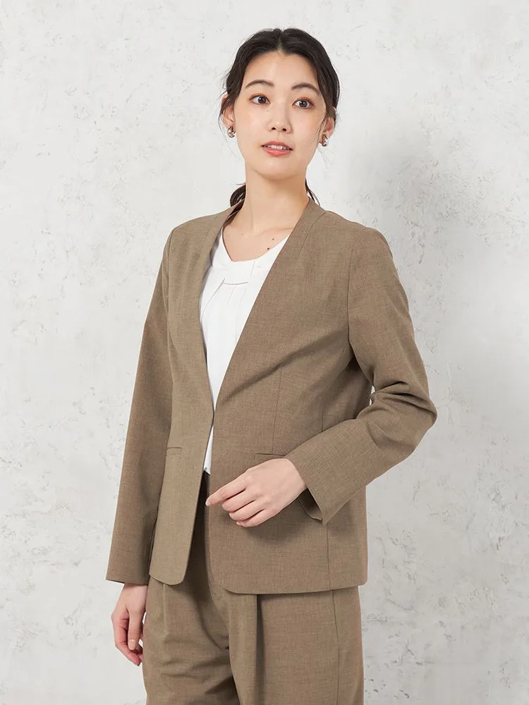 これからの季節にぴったりな、麻のような素材感でさらっとした肌触りのノーカラージャケットです。