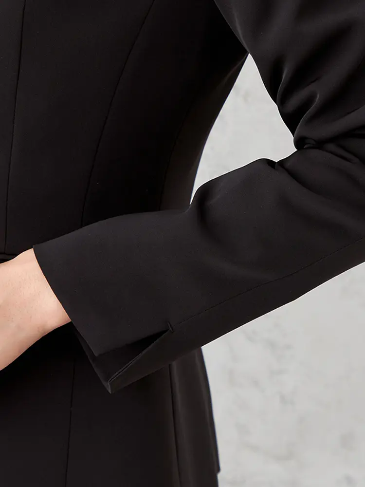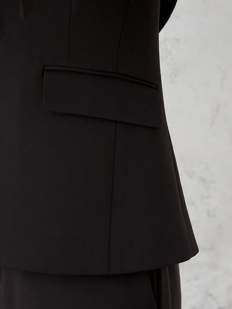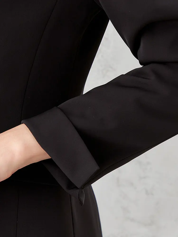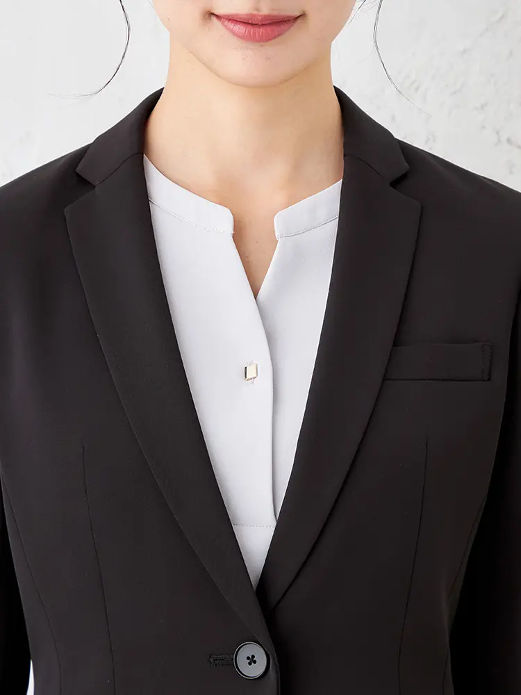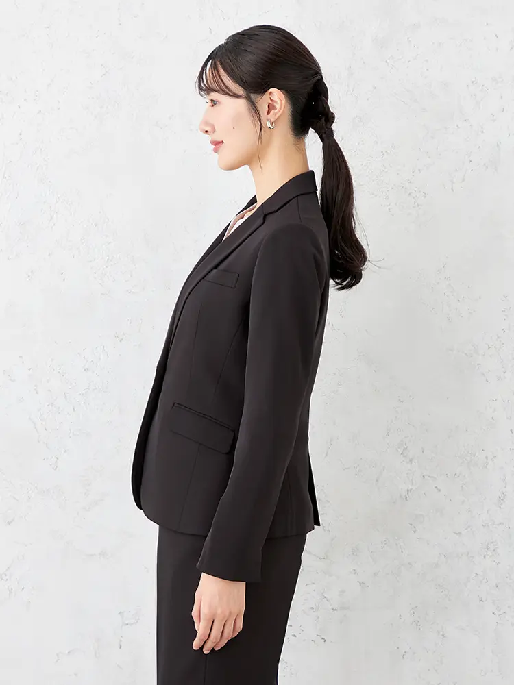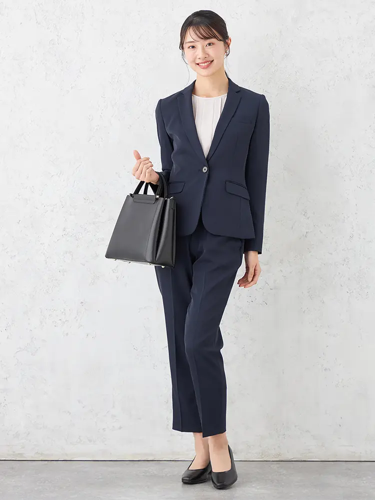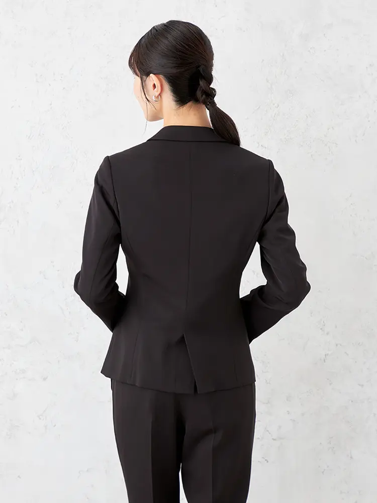 ジャケットはセンターベント・背抜き仕様、パンツは軽快なクロップド丈で、すっきりとした大人な女性らしさを演出。