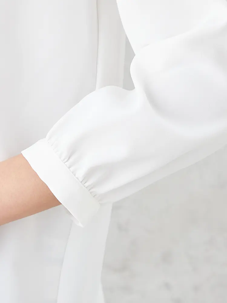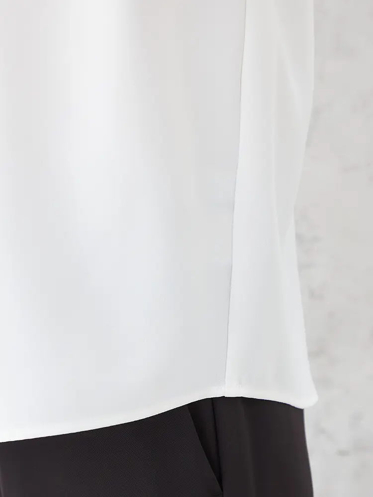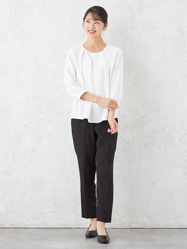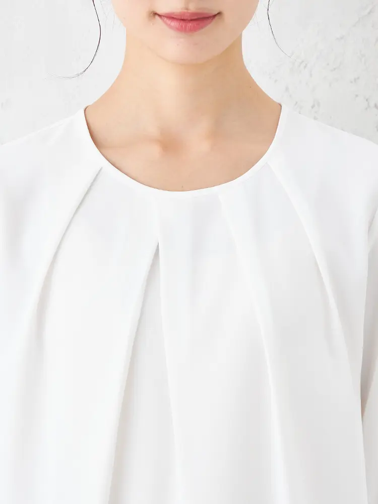 左右非対称のフロントタックが印象的な、7分袖のプルオーバーブラウスです。