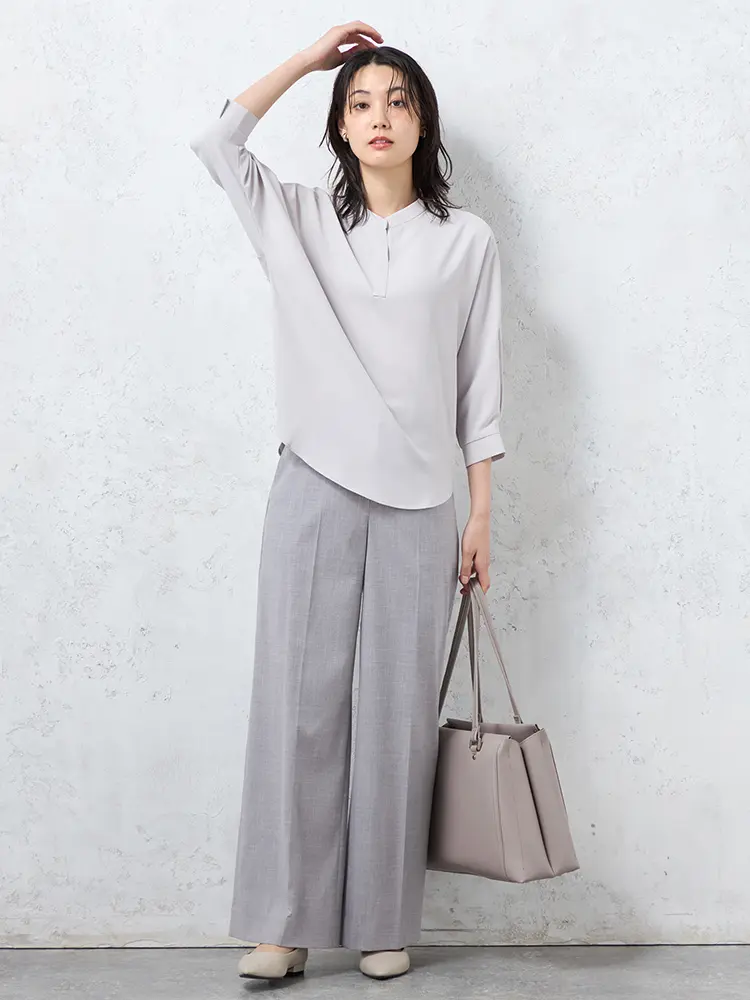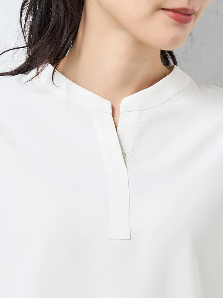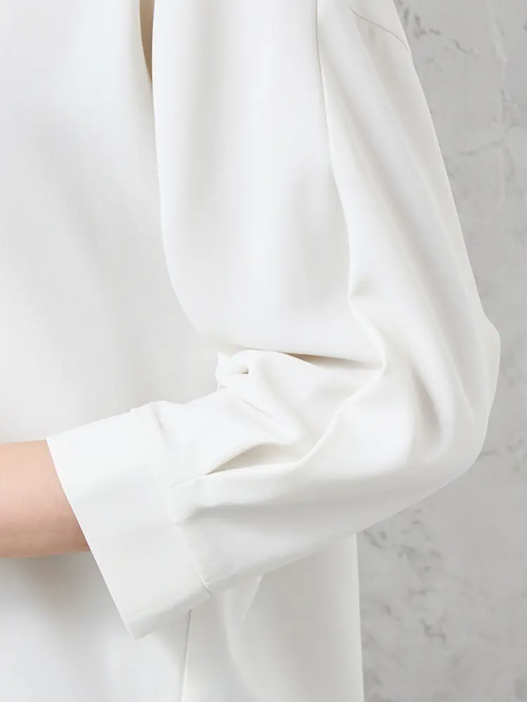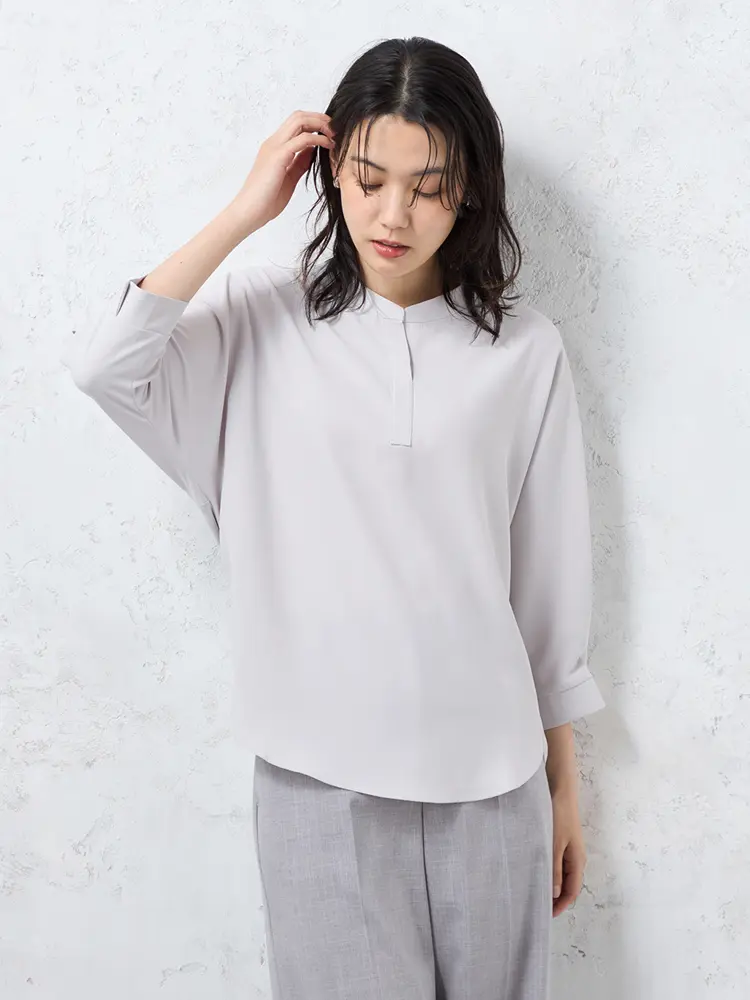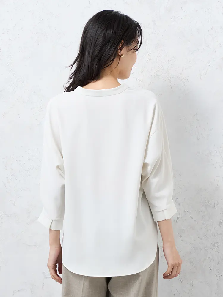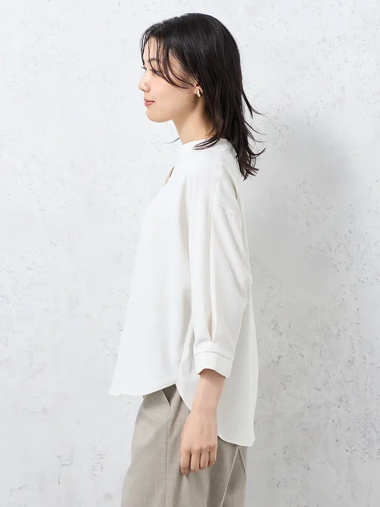 顔まわりをすっきり見せるシャープなスキッパーネックブラウス。