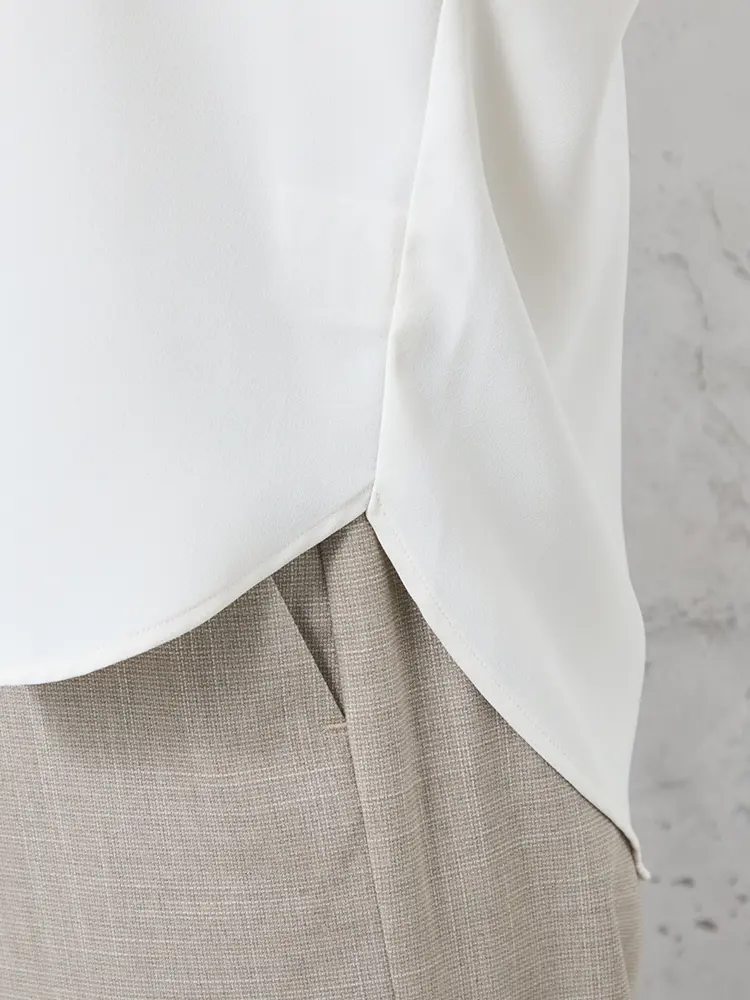 袖口のタックや前後差のある裾が洗練された印象を与え、ジャケットインも綺麗に決まります。