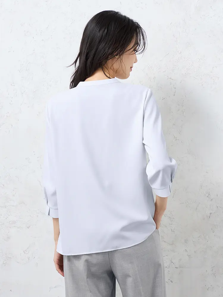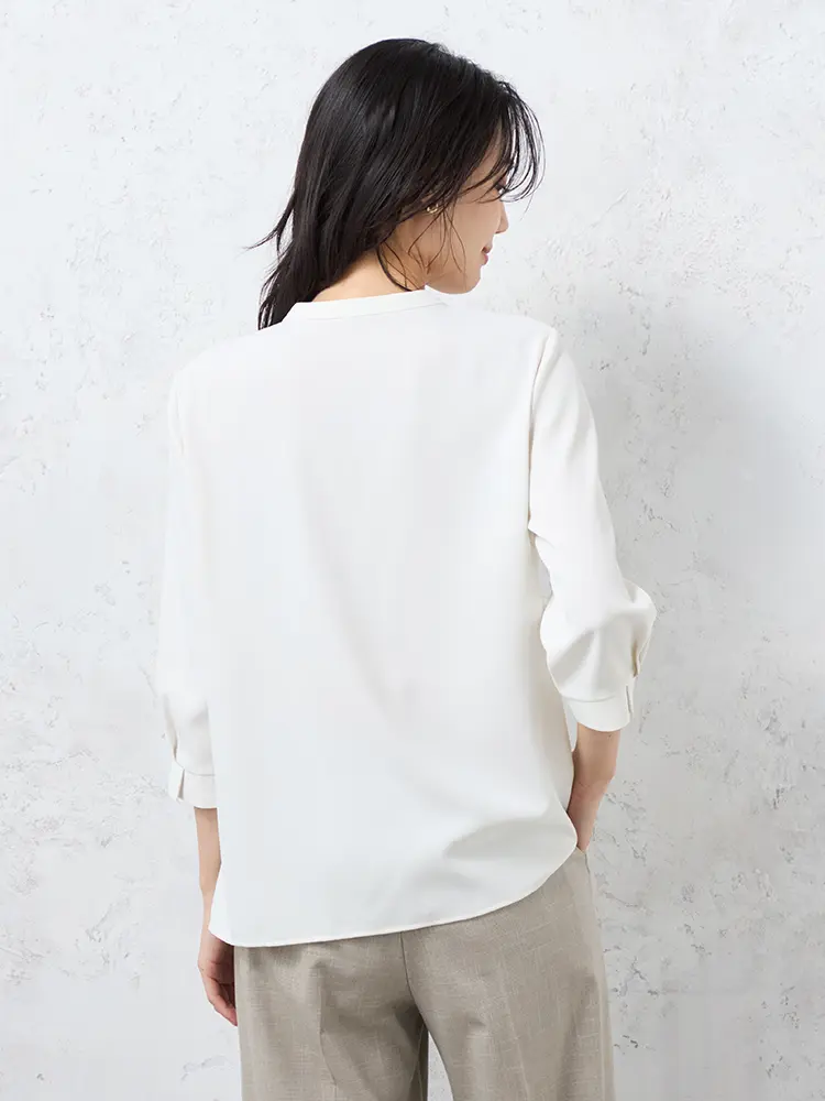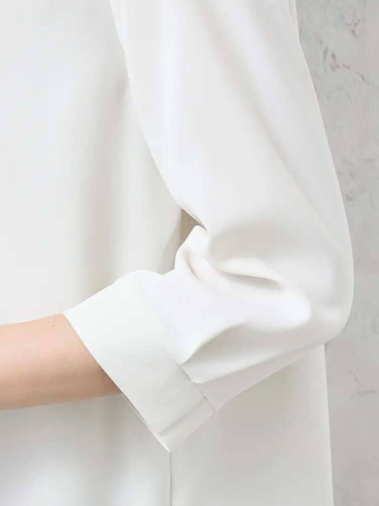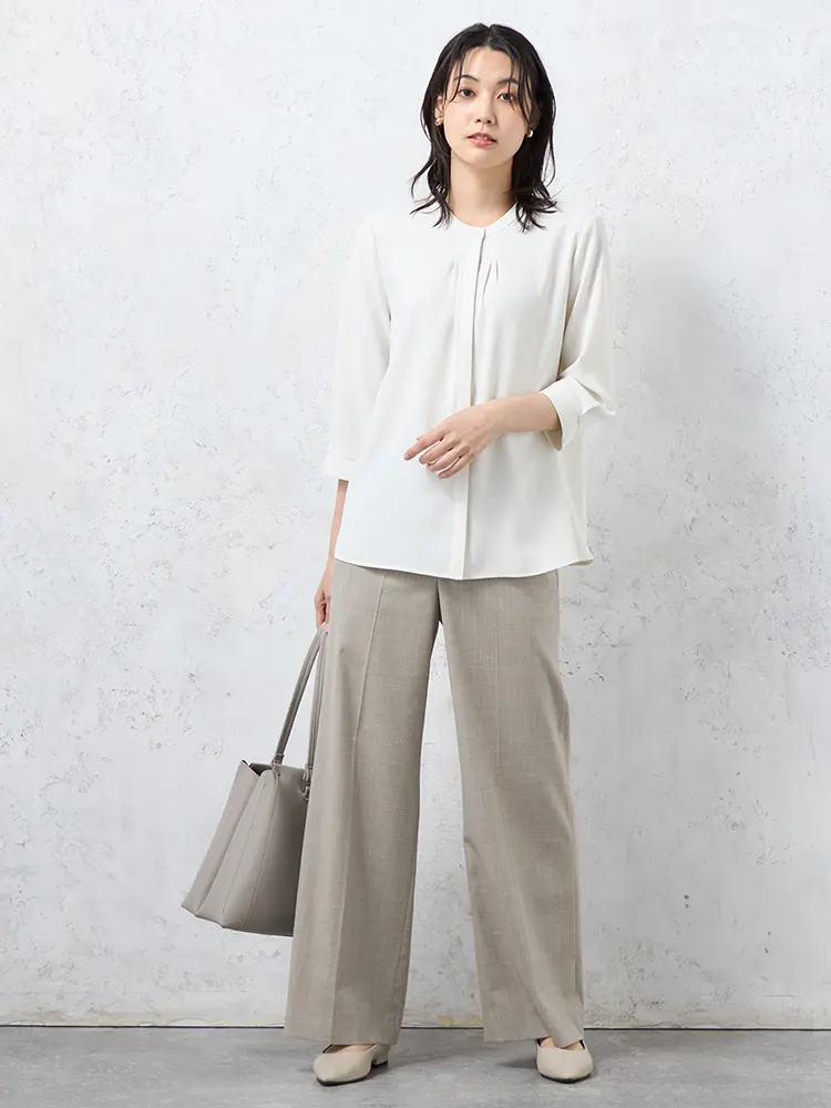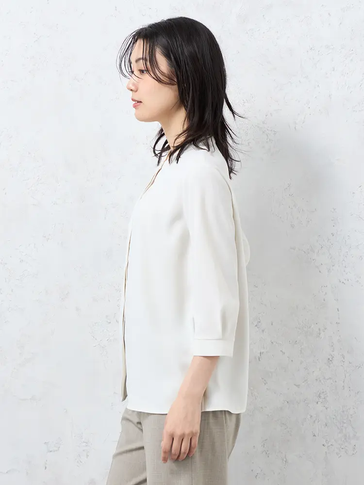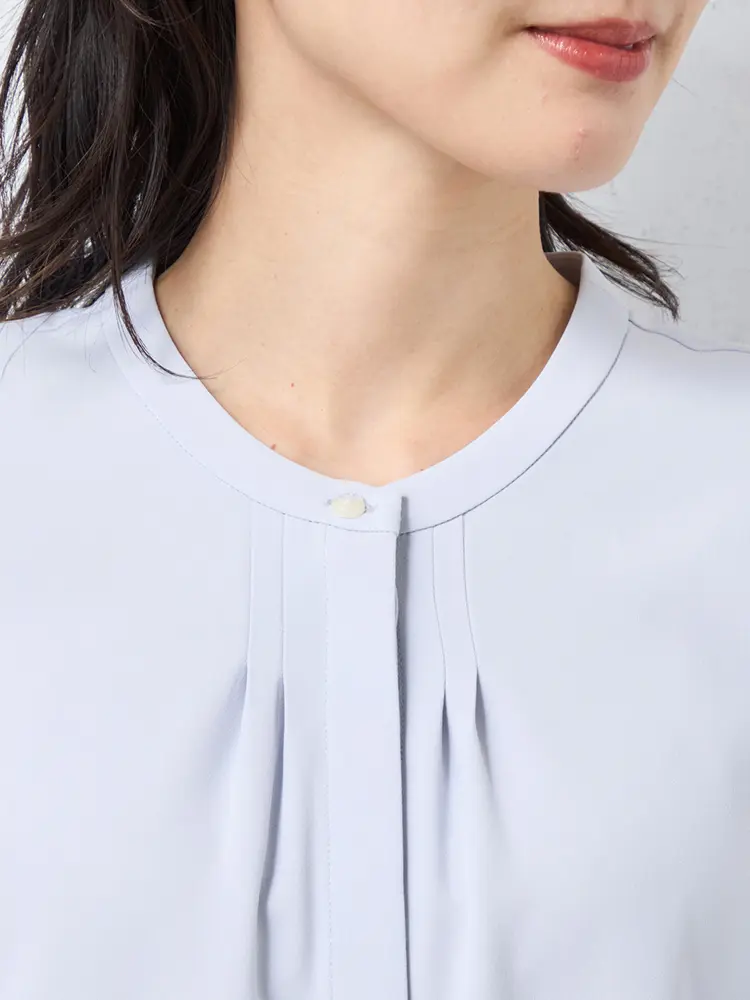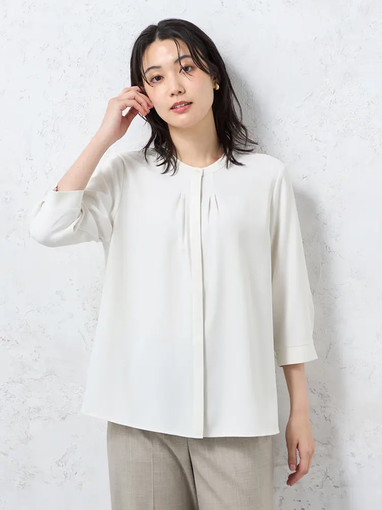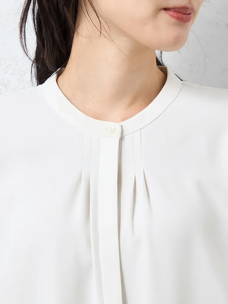 顔まわりをすっきりと見せてくれるバンドカラーにタックのあしらいで、さりげない華やかさをプラスしました。