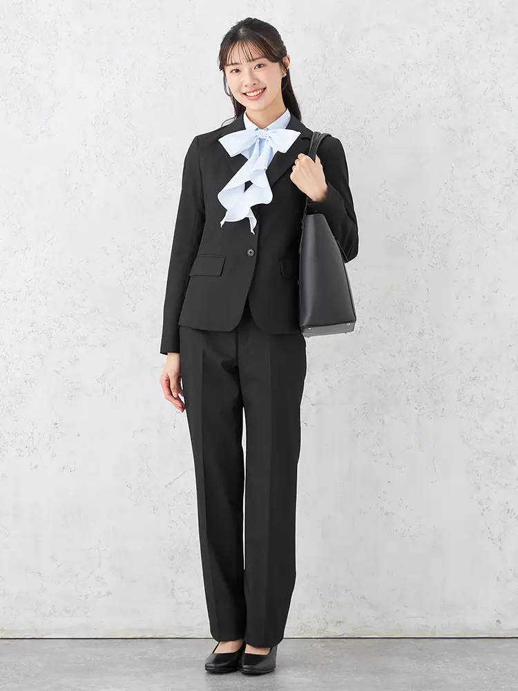 華やかなブラウスはもちろん、同素材ジャケットとのセットアップで落ち着いたスーツスタイルも可能。