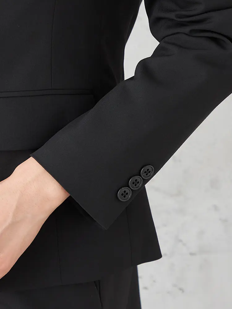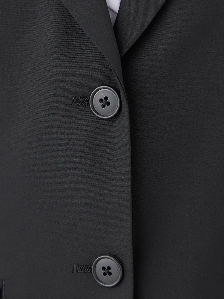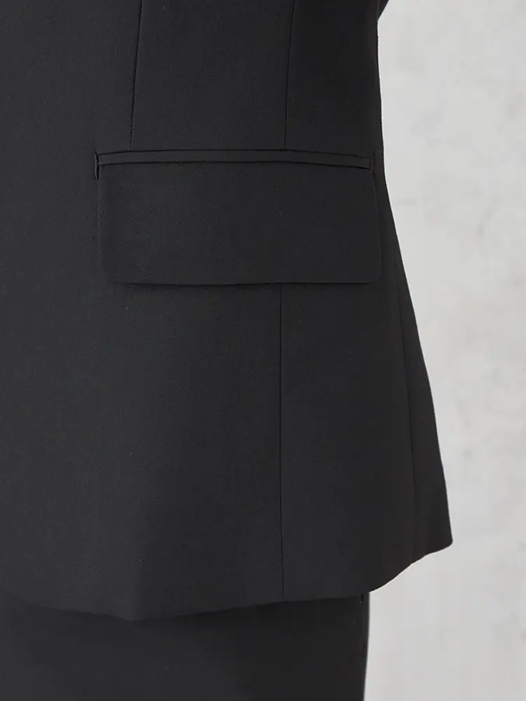 やや長めの着丈で安心感があり、箱ポケットや袖口の3つボタンが端正な印象を演出。