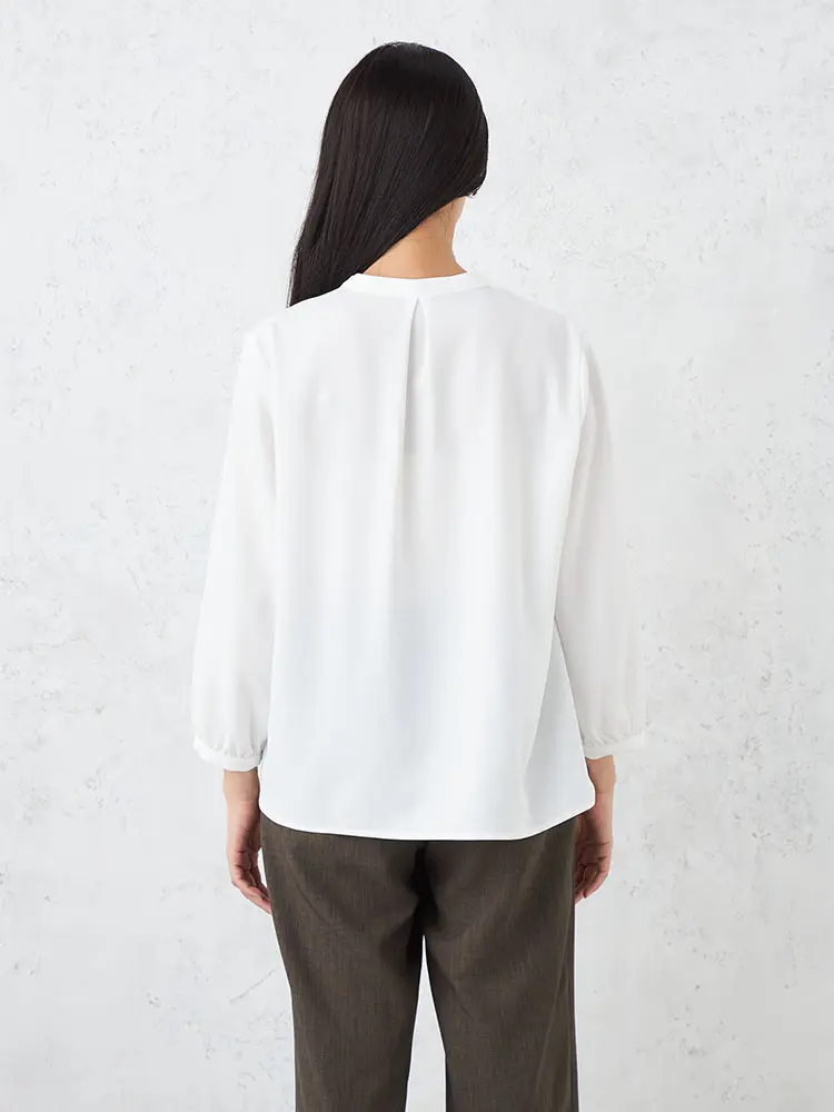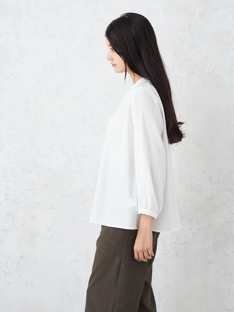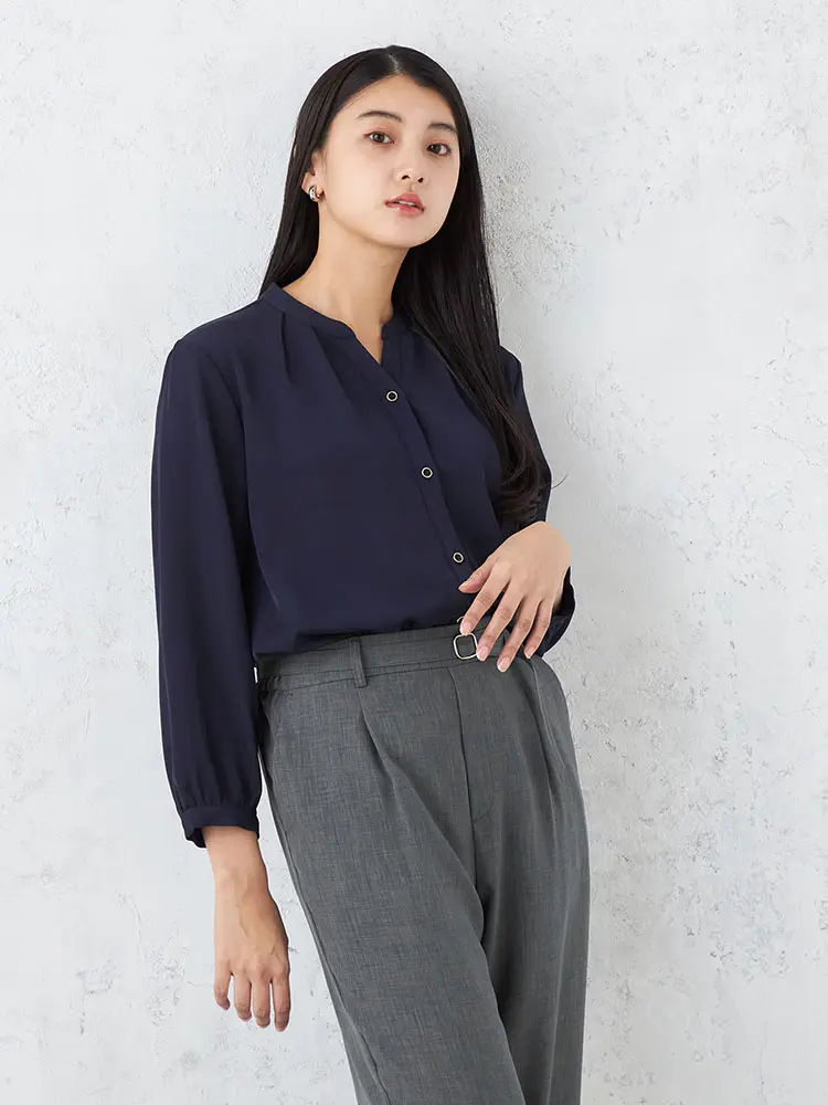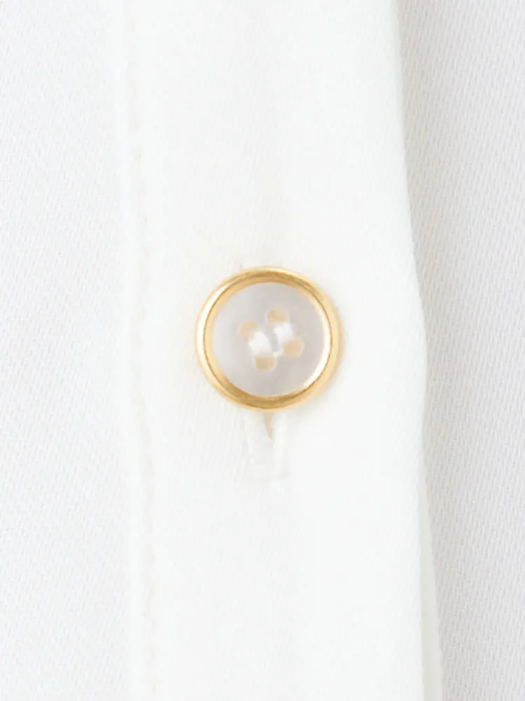 襟元のタックによる立体感と、程よい存在感のビジューボタンが上品なアクセント。