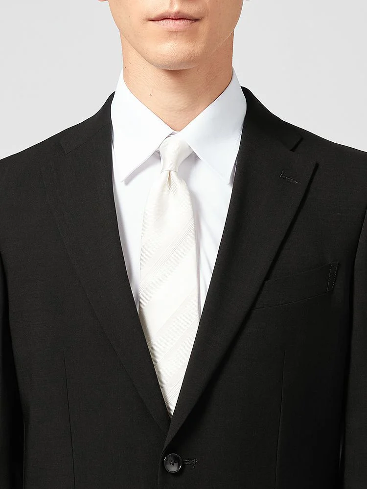ジャケットはスタンダードな2つボタンデザインで、スラックスは腰回りにゆとりのあるワンタックデザインを採用。