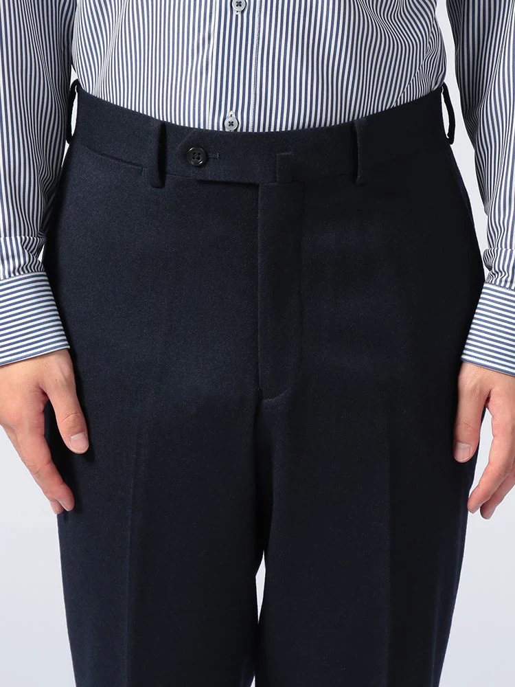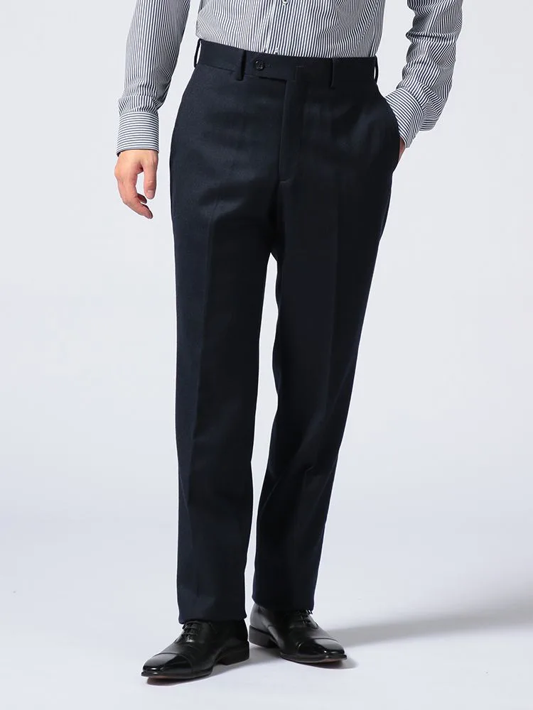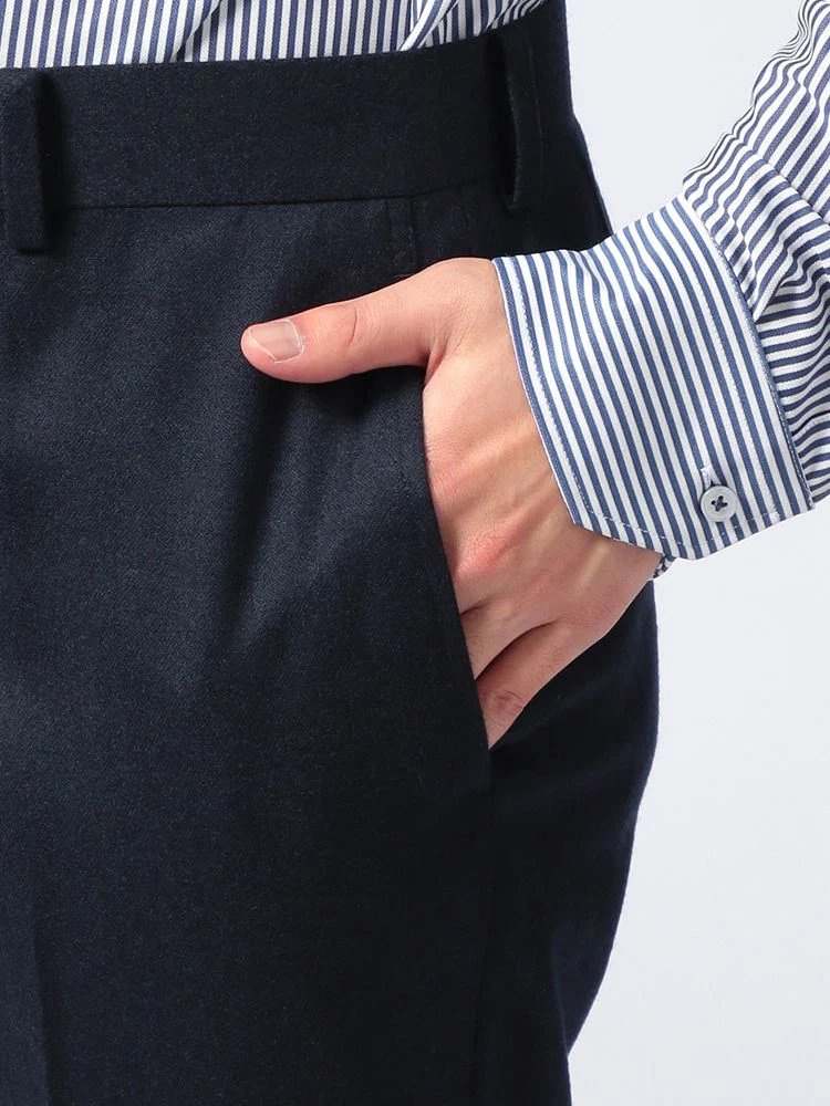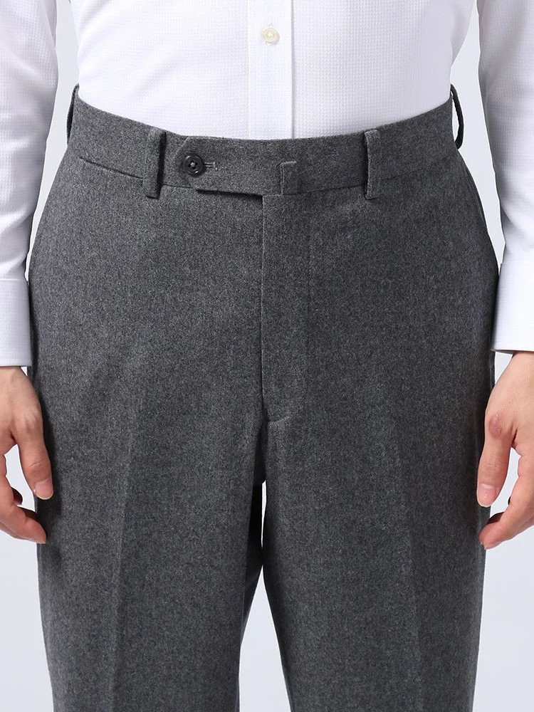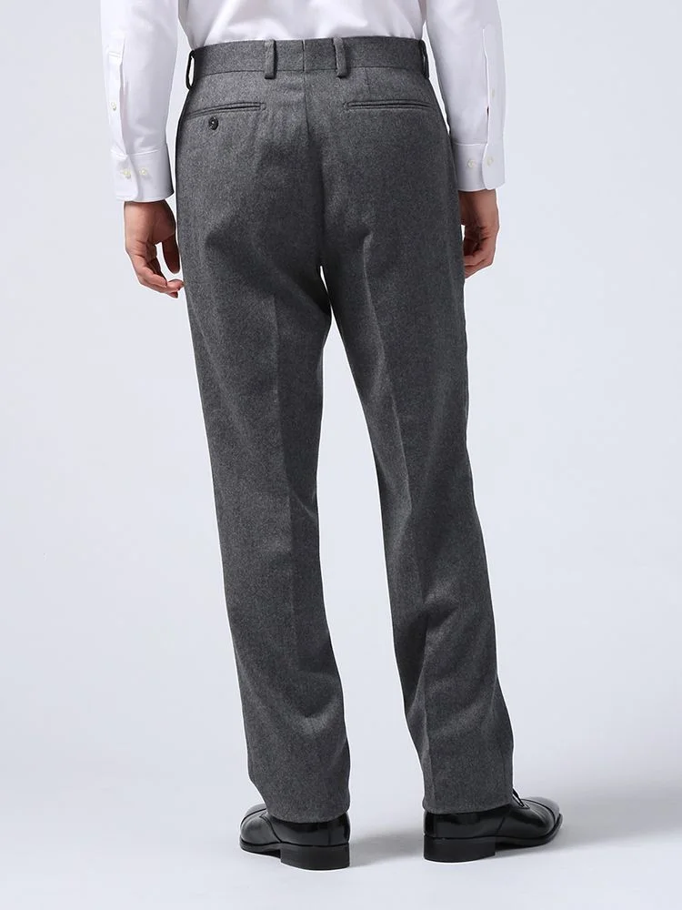 秋冬シーズンにぴったりな起毛感のあるウールフランネルを使用した、ノータック仕上げのスラックス。