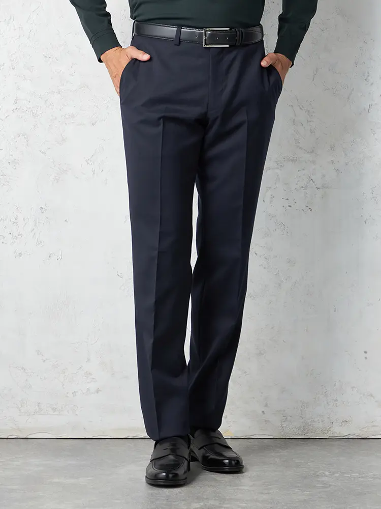 パンツの腰回りに生地の折り込みがなく、スッキリとしたシルエットを実現します。シンプルで洗練された印象を与え、すっきりとした着こなしが可能です。