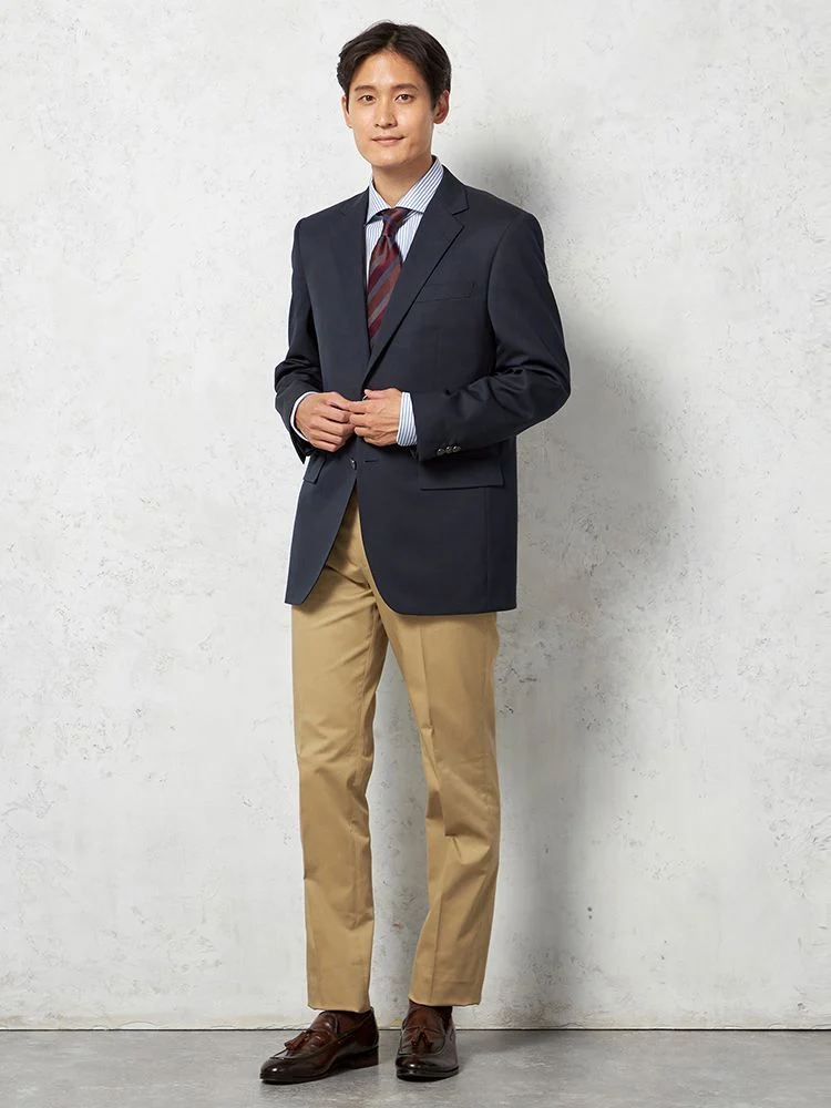 2つボタンのデザインで、クラシックなスタイルを演出。落ち着きと品のあるアイテムです。